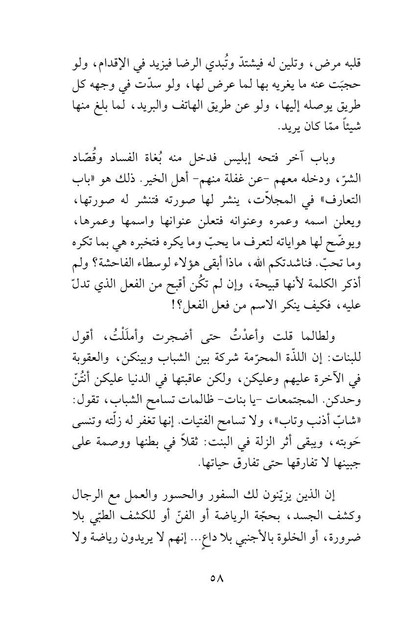 قلبه مرض، وتلين له فيشتدّ وتُبدي الرضا فيزيد في الإقدام، ولو حجبَت عنه ما يغريه بها لما عرض لها، ولو سدّت في وجهه كل طريق يوصله إليها، ولو عن طريق الهاتف والبريد، لما بلغ منها شيئاً ممّا كان يريد.