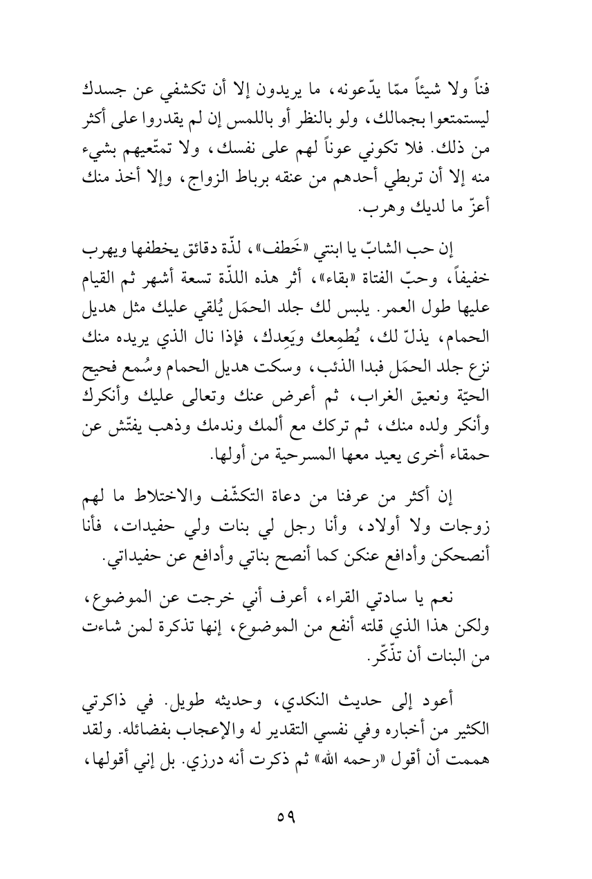فناً ولا شيئاً ممّا يدّعونه، ما يريدون إلا أن تكشفي عن جسدك ليستمتعوا بجمالك، ولو بالنظر أو باللمس إن لم يقدروا على أكثر من ذلك. فلا تكوني عوناً لهم على نفسك، ولا تمتّعيهم بشيء منه إلا أن تربطي أحدهم من عنقه برباط الزواج، وإلا أخذ منك أعزّ ما لديك وهرب.