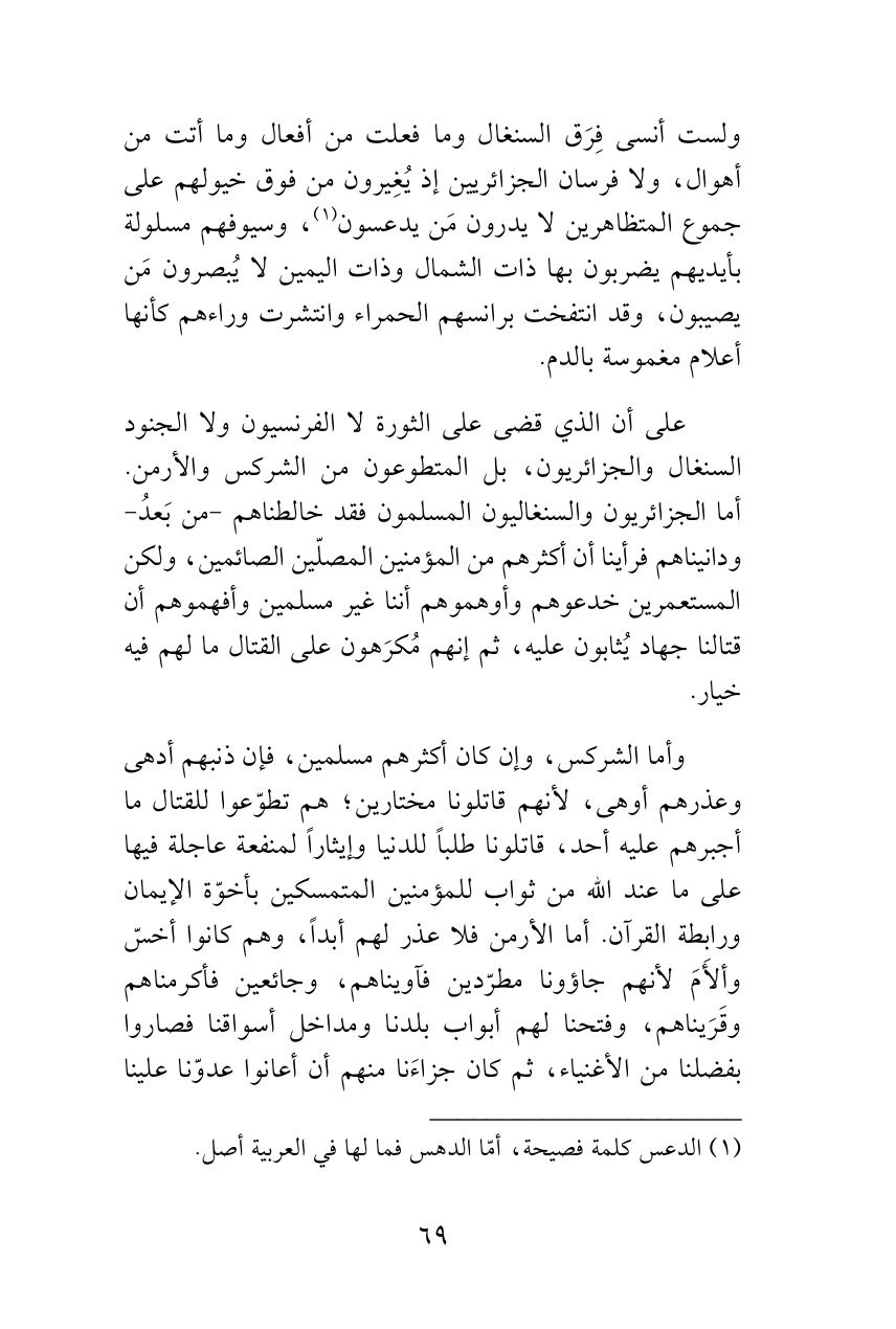 على أن الذي قضى على الثورة لا الفرنسيون ولا الجنود السنغال والجزائريون، بل المتطوعون من الشركس والأرمن. أما الجزائريون والسنغاليون المسلمون فقد خالطناهم -من بَعدُ- ودانيناهم فرأينا أن أكثرهم من المؤمنين المصلّين الصائمين، ولكن المستعمرين خدعوهم وأوهموهم أننا غير مسلمين وأفهموهم أن قتالنا جهاد يُثابون عليه، ثم إنهم مُكرَهون على القتال ما لهم فيه خيار.
