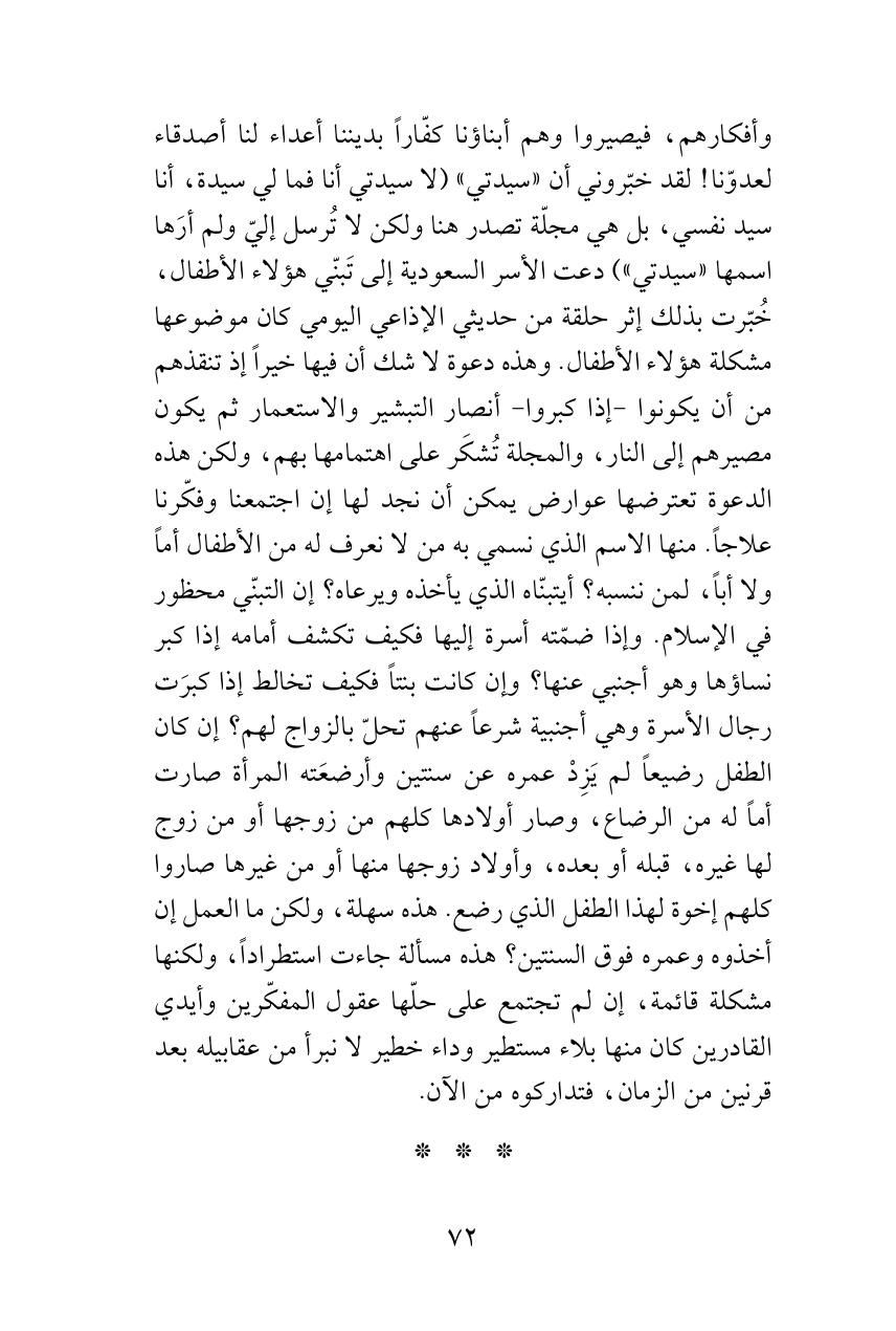 وأفكارهم، فيصيروا وهم أبناؤنا كفّاراً بديننا أعداء لنا أصدقاء لعدوّنا! لقد خبّروني أن «سيدتي» (لا سيدتي أنا فما لي سيدة، أنا سيد نفسي، بل هي مجلّة تصدر هنا ولكن لا تُرسل إليّ ولم أرَها اسمها «سيدتي») دعت الأسر السعودية إلى تَبنّي هؤلاء الأطفال، خُبّرت بذلك إثر حلقة من حديثي الإذاعي اليومي كان موضوعها مشكلة هؤلاء الأطفال. وهذه دعوة لا شك أن فيها خيراً إذ تنقذهم من أن يكونوا -إذا كبروا- أنصار التبشير والاستعمار ثم يكون مصيرهم إلى النار، والمجلة تُشكَر على اهتمامها بهم، ولكن هذه الدعوة تعترضها عوارض يمكن أن نجد لها إن اجتمعنا وفكّرنا علاجاً. منها الاسم الذي نسمي به من لا نعرف له من الأطفال أماً ولا أباً، لمن ننسبه؟ أيتبنّاه الذي يأخذه ويرعاه؟ إن التبنّي محظور في الإسلام. وإذا ضمّته أسرة إليها فكيف تكشف أمامه إذا كبر نساؤها وهو أجنبي عنها؟ وإن كانت بنتاً فكيف تخالط إذا كبرَت رجال الأسرة وهي أجنبية شرعاً عنهم تحلّ بالزواج لهم؟ إن كان الطفل رضيعاً لم يَزِدْ عمره عن سنتين وأرضعَته المرأة صارت أماً له من الرضاع، وصار أولادها كلهم من زوجها أو من زوج لها غيره، قبله أو بعده، وأولاد زوجها منها أو من غيرها صاروا كلهم إخوة لهذا الطفل الذي رضع. هذه سهلة، ولكن ما العمل إن أخذوه وعمره فوق السنتين؟ هذه مسألة جاءت استطراداً، ولكنها مشكلة قائمة، إن لم تجتمع على حلّها عقول المفكّرين وأيدي القادرين كان منها بلاء مستطير وداء خطير لا نبرأ من عقابيله بعد قرنين من الزمان، فتداركوه من الآن.