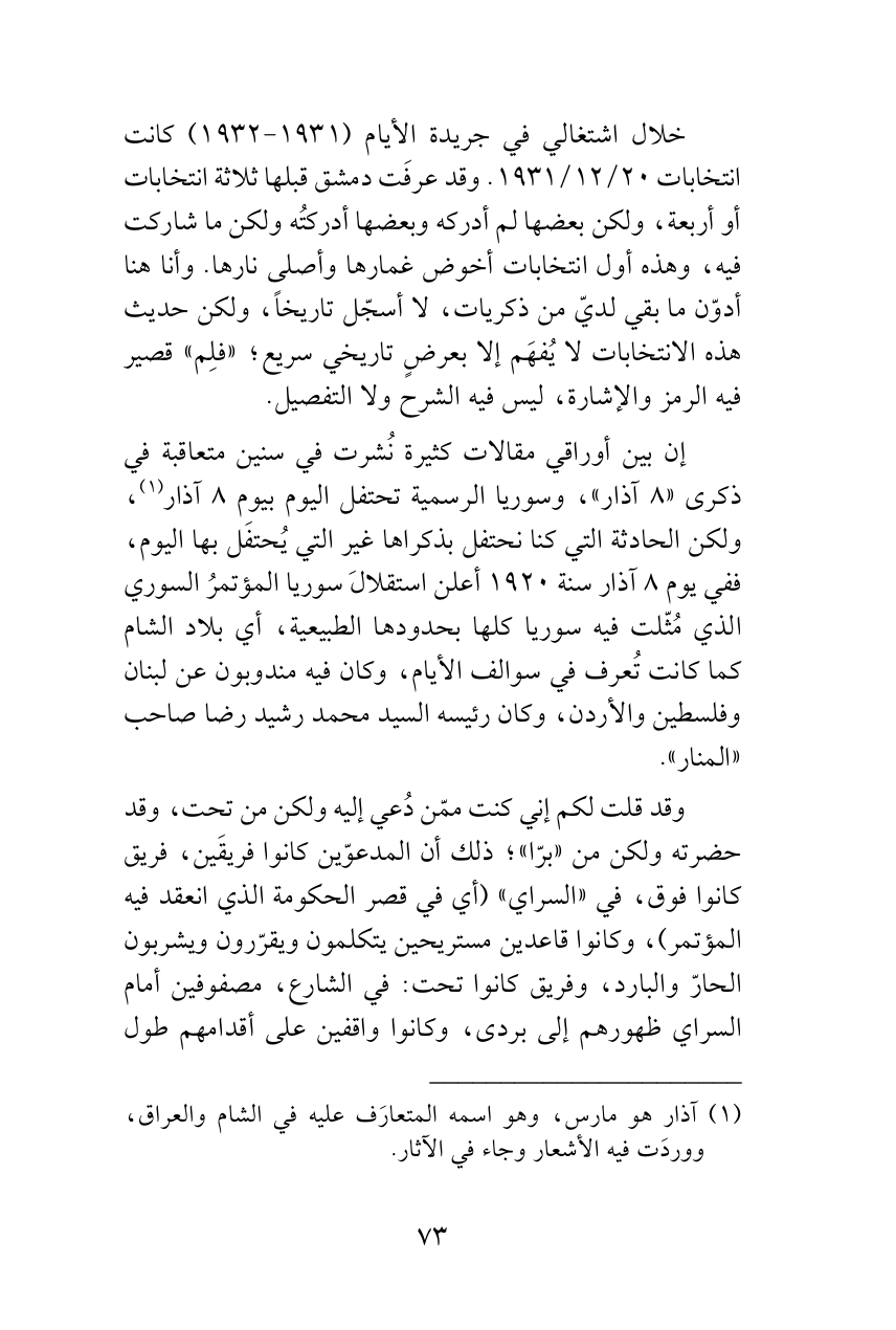 خلال اشتغالي في جريدة الأيام (1931 - 1932) كانت انتخابات 20/ 12/1931. وقد عرفَت دمشق قبلها ثلاثة انتخابات أو أربعة، ولكن بعضها لم أدركه وبعضها أدركتُه ولكن ما شاركت فيه، وهذه أول انتخابات أخوض غمارها وأصلى نارها. وأنا هنا أدوّن ما بقي لديّ من ذكريات، لا أسجّل تاريخاً، ولكن حديث هذه الانتخابات لا يُفهَم إلا بعرضٍ تاريخي سريع؛ «فلِم» قصير فيه الرمز والإشارة، ليس فيه الشرح ولا التفصيل.