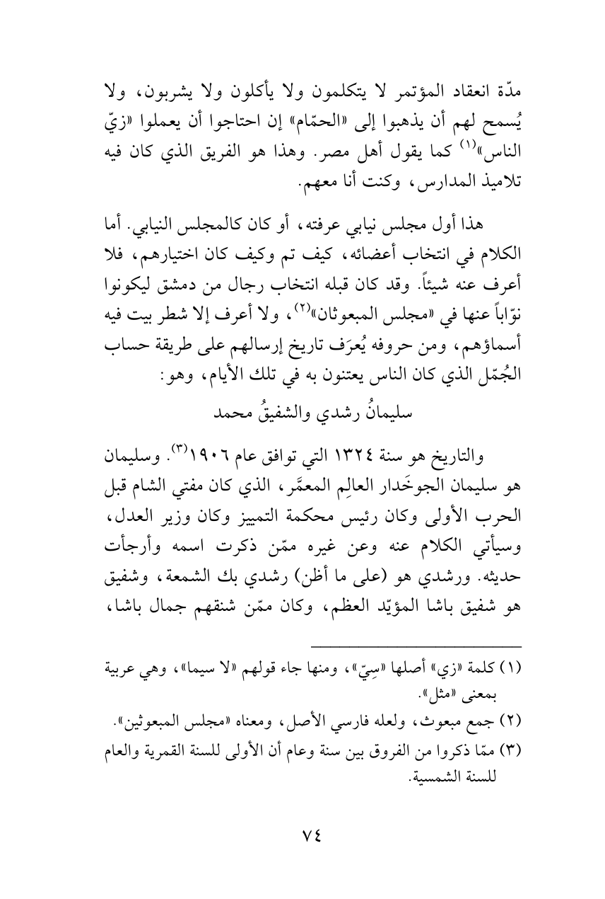 والتاريخ هو سنة 1324 التي توافق عام 1906 (¬3). وسليمان هو سليمان الجوخَدار العالِم المعمَّر، الذي كان مفتي الشام قبل الحرب الأولى وكان رئيس محكمة التمييز وكان وزير العدل، وسيأتي الكلام عنه وعن غيره ممّن ذكرت اسمه وأرجأت حديثه. ورشدي هو (على ما أظن) رشدي بك الشمعة، وشفيق هو شفيق باشا المؤيّد العظم، وكان ممّن شنقهم جمال باشا،