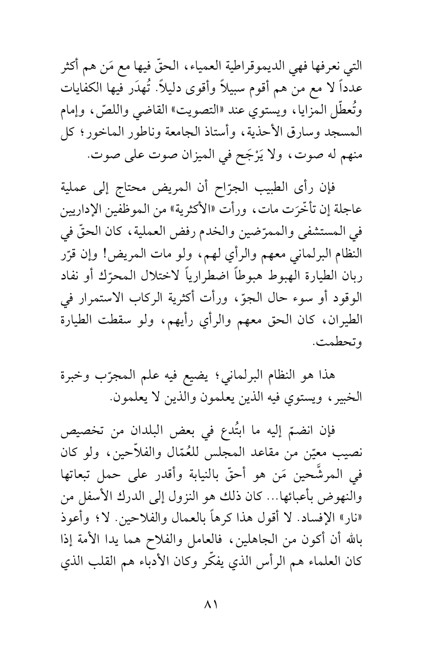 فإن رأى الطبيب الجرّاح أن المريض محتاج إلى عملية عاجلة إن تأخّرَت مات، ورأت «الأكثرية» من الموظفين الإداريين في المستشفى والممرّضين والخدم رفض العملية، كان الحقّ في النظام البرلماني معهم والرأي لهم، ولو مات المريض! وإن قرّر ربان الطيارة الهبوط هبوطاً اضطرارياً لاختلال المحرّك أو نفاد الوقود أو سوء حال الجوّ، ورأت أكثرية الركاب الاستمرار في الطيران، كان الحق معهم والرأي رأيهم، ولو سقطت الطيارة وتحطمت.