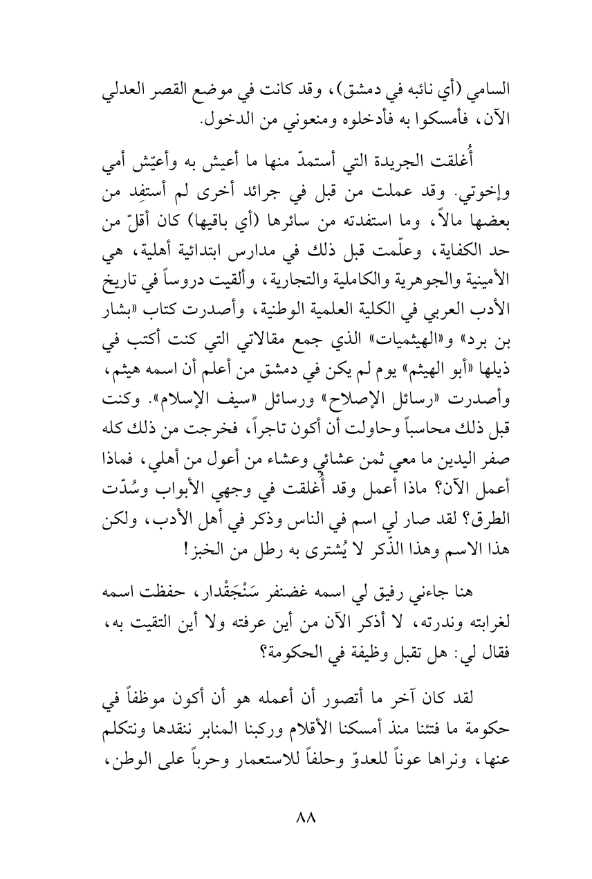 أُغلقت الجريدة التي أستمدّ منها ما أعيش به وأعيّش أمي وإخوتي. وقد عملت من قبل في جرائد أخرى لم أستفِد من بعضها مالاً، وما استفدته من سائرها (أي باقيها) كان أقلّ من حد الكفاية، وعلّمت قبل ذلك في مدارس ابتدائية أهلية، هي الأمينية والجوهرية والكاملية والتجارية، وألقيت دروساً في تاريخ الأدب العربي في الكلية العلمية الوطنية، وأصدرت كتاب «بشار بن برد» و «الهيثميات» الذي جمع مقالاتي التي كنت أكتب في ذيلها «أبوالهيثم» يوم لم يكن في دمشق من أعلم أن اسمه هيثم، وأصدرت «رسائل الإصلاح» ورسائل «سيف الإسلام». وكنت قبل ذلك محاسباً وحاولت أن أكون تاجراً، فخرجت من ذلك كله صفر اليدين ما معي ثمن عشائي وعشاء من أعول من أهلي، فماذا أعمل الآن؟ ماذا أعمل وقد أُغلقت في وجهي الأبواب وسُدّت الطرق؟ لقد صار لي اسم في الناس وذكر في أهل الأدب، ولكن هذا الاسم وهذا الذّكر لا يُشترى به رطل من الخبز!