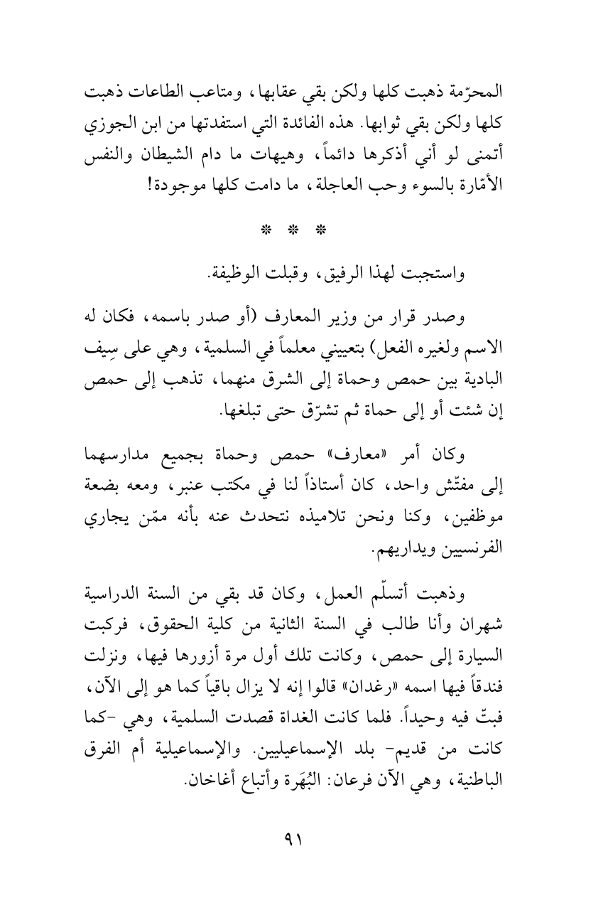 وذهبت أتسلّم العمل، وكان قد بقي من السنة الدراسية شهران وأنا طالب في السنة الثانية من كلية الحقوق، فركبت السيارة إلى حمص، وكانت تلك أول مرة أزورها فيها، ونزلت فندقاً فيها اسمه «رغدان» قالوا إنه لا يزال باقياً كما هو إلى الآن، فبتّ فيه وحيداً. فلما كانت الغداة قصدت السلمية، وهي -كما كانت من قديم- بلد الإسماعيليين. والإسماعيلية أم الفرق الباطنية، وهي الآن فرعان: البُهَرة وأتباع أغاخان.