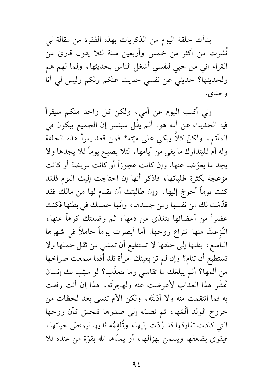 إني أكتب اليوم عن أمي، ولكن كل واحد منكم سيقرأ فيه الحديث عن أمه هو. ألم يقُل سبنسر إن الجميع يبكون في المآتم، ولكنّ كلاًّ يبكي على ميّته؟ فمن قعد يقرأ هذه الحلقة وله أم فليتدارك ما بقي من أيامها، لئلا يصبح يوماً فلا يجدها ولا يجد ما يعوّضه عنها. وإن كانت عجوزاً أو كانت مريضة أو كانت مزعجة بكثرة طلباتها، فاذكر أنها إن احتاجت إليك اليوم فلقد كنت يوماً أحوجَ إليها، وإن طالبَتك أن تقدم لها من مالك فقد قدّمَت لك من نفسها ومن جسدها، وأنها حملتك في بطنها فكنت عضواً من أعضائها يتغذى من دمها، ثم وضعتك كرهاً عنها، انتُزِعتَ منها انتزاع روحها. أما أبصرت يوماً حاملاً في شهرها التاسع، بطنها إلى حلقها لا تستطيع أن تمشي من ثقل حملها ولا تستطيع أن تنام؟ وإن لم ترَ بعينك امرأة تلد أفما سمعت صراخها من ألمها؟ ألم يبلغك ما تقاسي وما تتعذّب؟ لو سبّب لك إنسان عُشْر هذا العذاب لأعرضت عنه ولهجرتَه، هذا إن أنت رفقت به فما انتقمت منه ولا آذيتَه، ولكن الأم تنسى بعد لحظات من خروج الولد ألَمَها، ثم تضمّه إلى صدرها فتحسّ كأن روحها التي كادت تفارقها قد رُدّت إليها، وتُلقِمُه ثديها ليمتصّ حياتها، فيقوى بضعفها ويسمن بهزالها، أو يمدّها الله بقوّة من عنده فلا