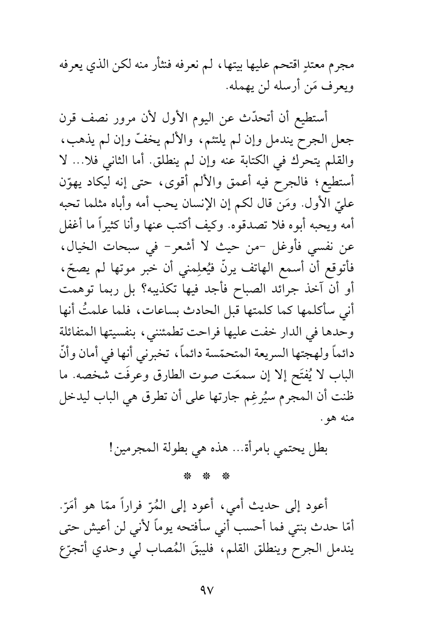 أعود إلى حديث أمي، أعود إلى المُرّ فراراً ممّا هو أمَرّ. أمّا حدث بنتي فما أحسب أني سأفتحه يوماً لأني لن أعيش حتى يندمل الجرح وينطلق القلم، فليبقَ المُصاب لي وحدي أتجرّع