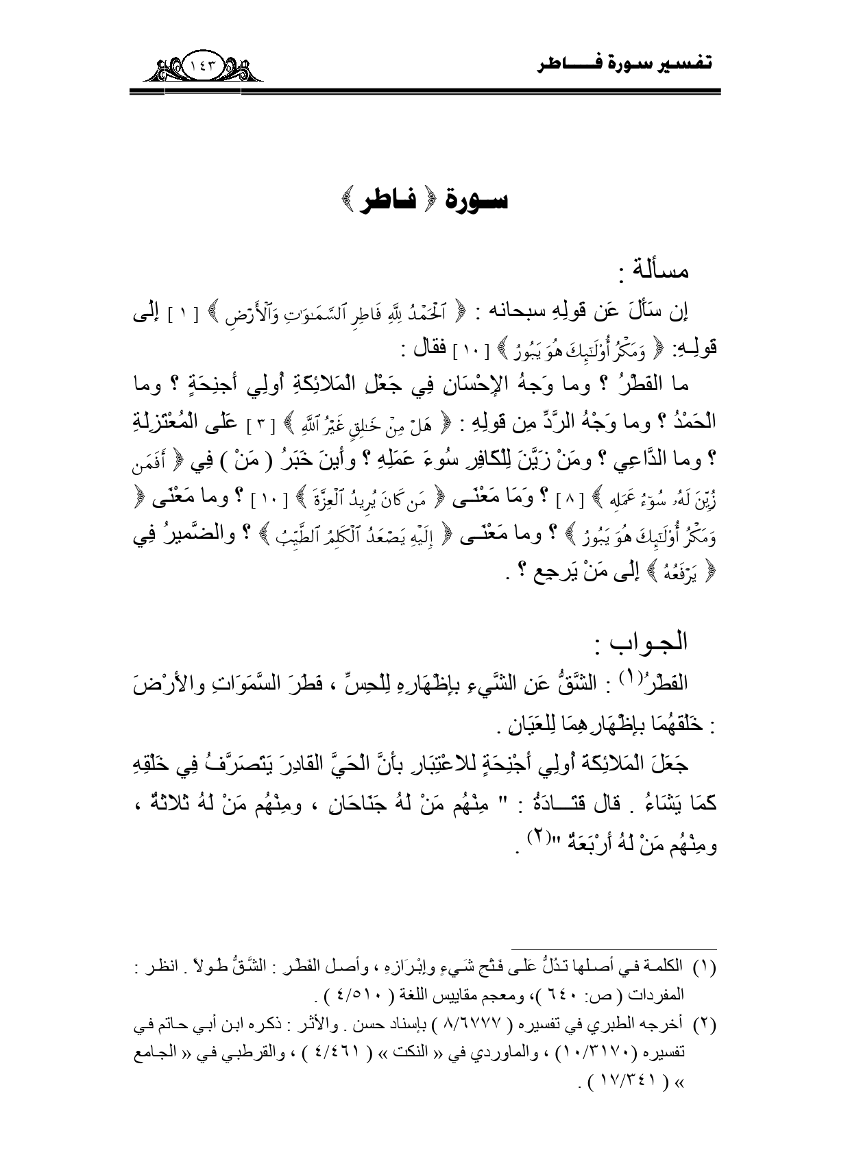 ما الفطرُ؟ وما وجه الإحسان في جعل الملائكة أولى أجنحة؟ وما الحمد؟ وما وجه الرد من قوله: {هَلْ مِنْ خَالِقٍ غَيْرُ اللَّهِ} [3] على المعتزلة؟ وما الداعي؟ ومن زين للكافر سوء عمله؟ وأين خبر (منْ) في {أَفَمَنْ زُيِّنَ لَهُ سُوءُ عَمَلِهِ} [8] ؟ وما معنى {مَنْ كَانَ يُرِيدُ الْعِزَّةَ} [10] ؟ وما معنى {وَمَكْرُ أُولَئِكَ هُوَ يَبُورُ} ؟ وما معنى {إِلَيْهِ يَصْعَدُ الْكَلِمُ الطَّيِّبُ} ؟ والضمير في {يَرْفَعُهُ} إلى من يرجع؟.