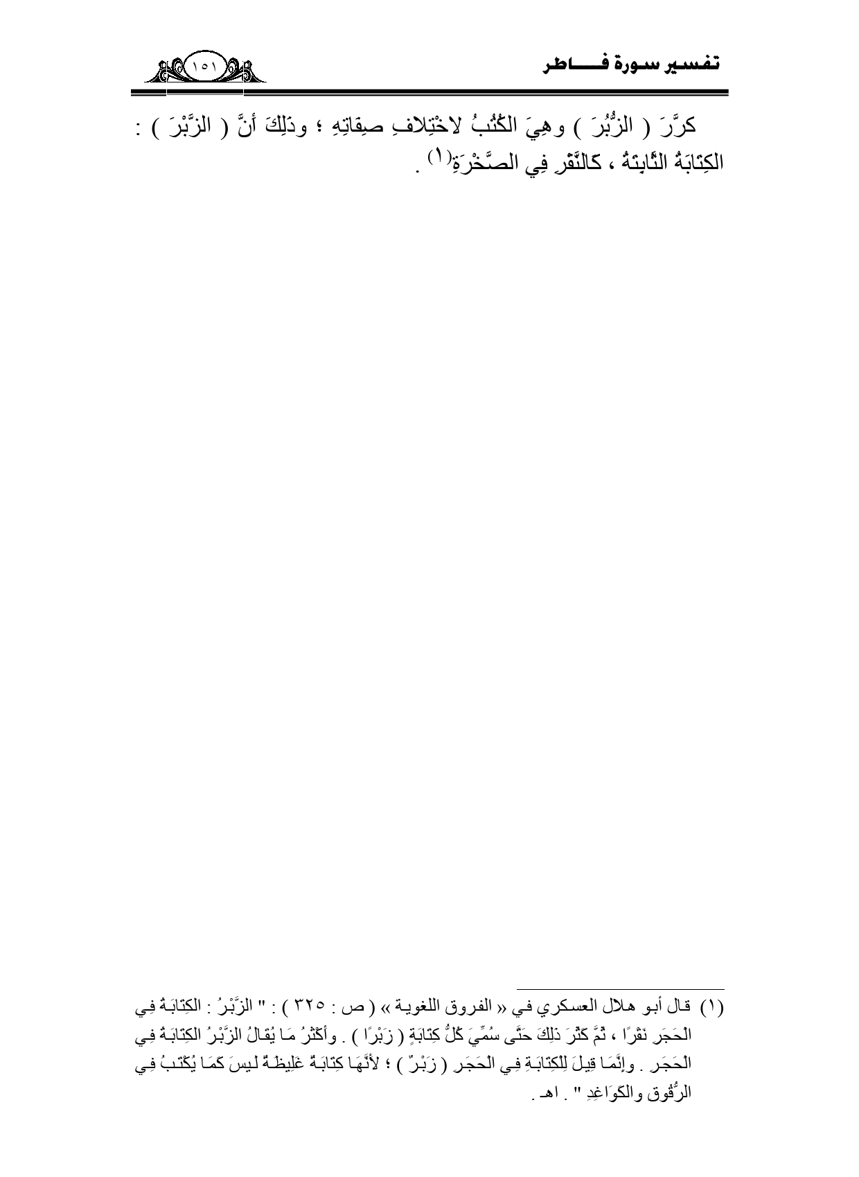 كرر (الزُّبُرَ) وهي الكتب لاختلاف صفاته، وذلك أن (الزَّبْرَ) : الكتابة الثابتة، كالنقرِ في الصخْرَةِ.