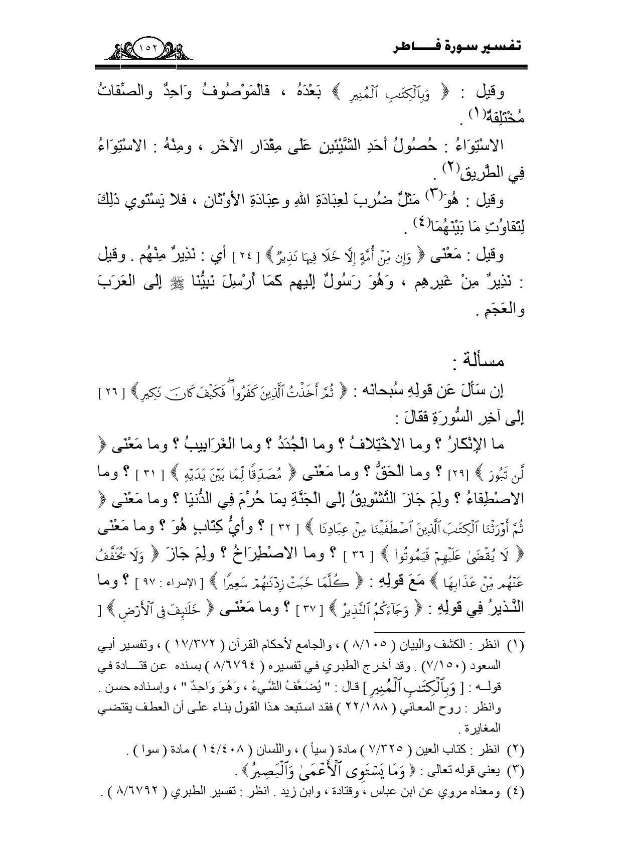 ما الإنكار؟ وما الاختلاف؟ وما الجددُ؟ وما الغرابيب؟ وما معنى {لَنْ تَبُورَ} [29] ؟ وما الحق؟ وما معنى {مُصَدِّقًا لِمَا بَيْنَ يَدَيْهِ} [31] ؟ وما الاصطفاء؟ ولم جاز التشويق إلى الجنة بما حرم في الدنيا؟ وما معنى {ثُمَّ أَوْرَثْنَا الْكِتَابَ الَّذِينَ اصْطَفَيْنَا مِنْ عِبَادِنَا} [32] ؟ وأي كتاب هو؟ وما معنى {لَا يُقْضَى عَلَيْهِمْ فَيَمُوتُوا} [36] ؟ وما الاصطراخ؟ ولم جاز {وَلَا يُخَفَّفُ عَنْهُمْ مِنْ عَذَابِهَا} مع قوله: {كُلَّمَا خَبَتْ زِدْنَاهُمْ سَعِيرًا} [الإسراء: 97] ؟ وما النذير في قوله: {وَجَاءَكُمُ النَّذِيرُ} [37] ؟ وما معنى {خَلَائِفَ فِي الْأَرْضِ} [