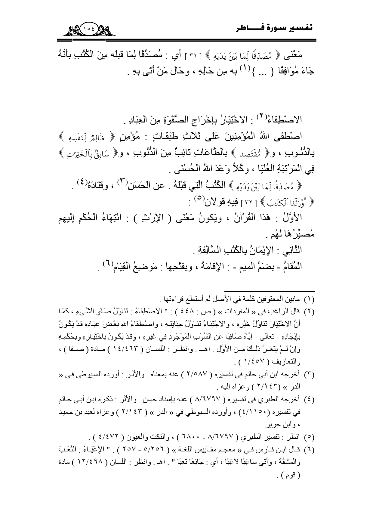 اصطفى الله المؤمنين على ثلاث طبقات: مؤمن {ظَالِمٌ لِنَفْسِهِ} بالذنوب، و {مُقْتَصِدٌ} بالطاعات تائب من الذنوب، و {سَابِقٌ بِالْخَيْرَاتِ} في المرتبة العليا، وكلا وعد الله الحسنى.