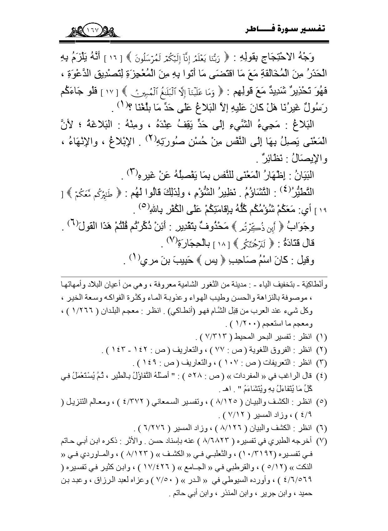 التطير: التشاؤم. نظير الشؤم، ولذلك قالوا لهم: {طَائِرُكُمْ مَعَكُمْ} [19] أي: معكم شؤمكم كله بإقامتكم على الكفر بالله.