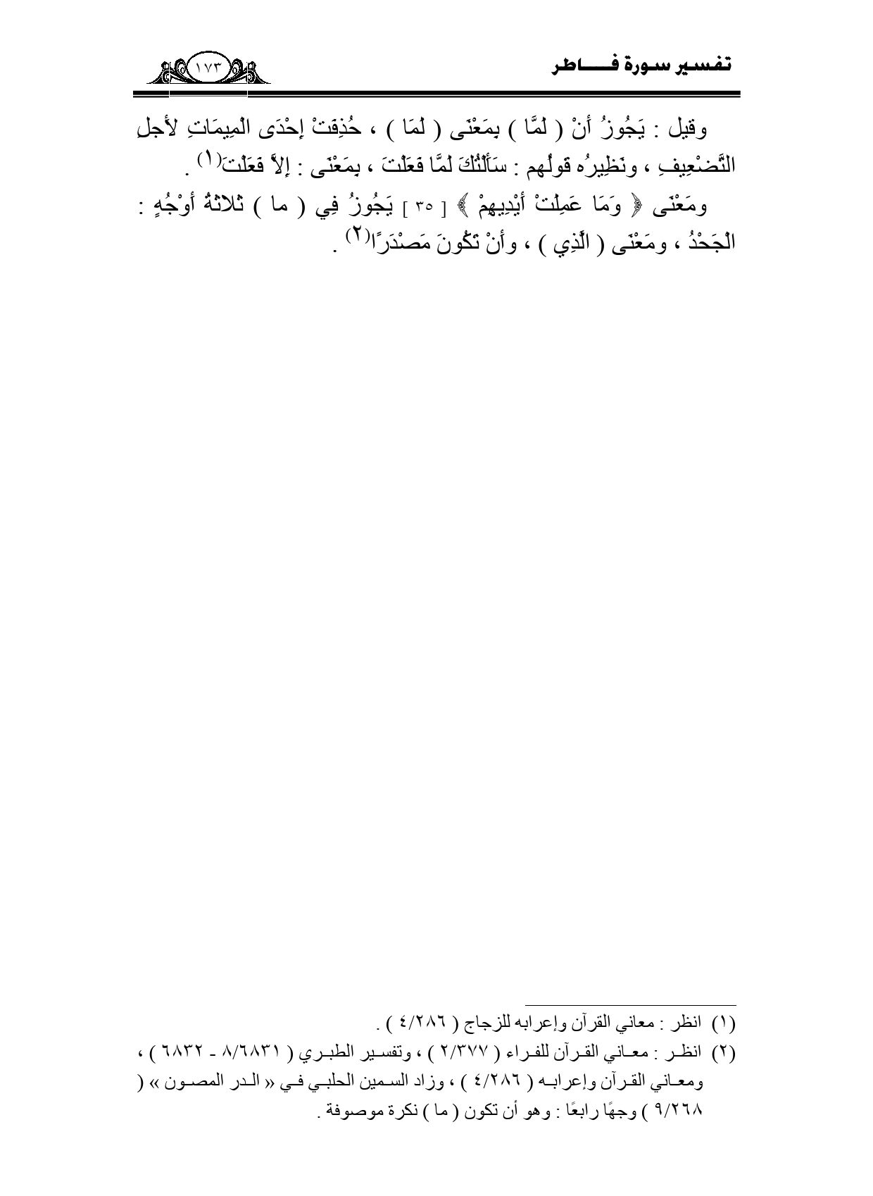ومعنى {وَمَا عَمِلَتْهُ أَيْدِيهِمْ} [35] يجوز في (ما) ثلاثة أوجه: الجحد، ومعنى (الذي) ، وأن تكون مصدرا.