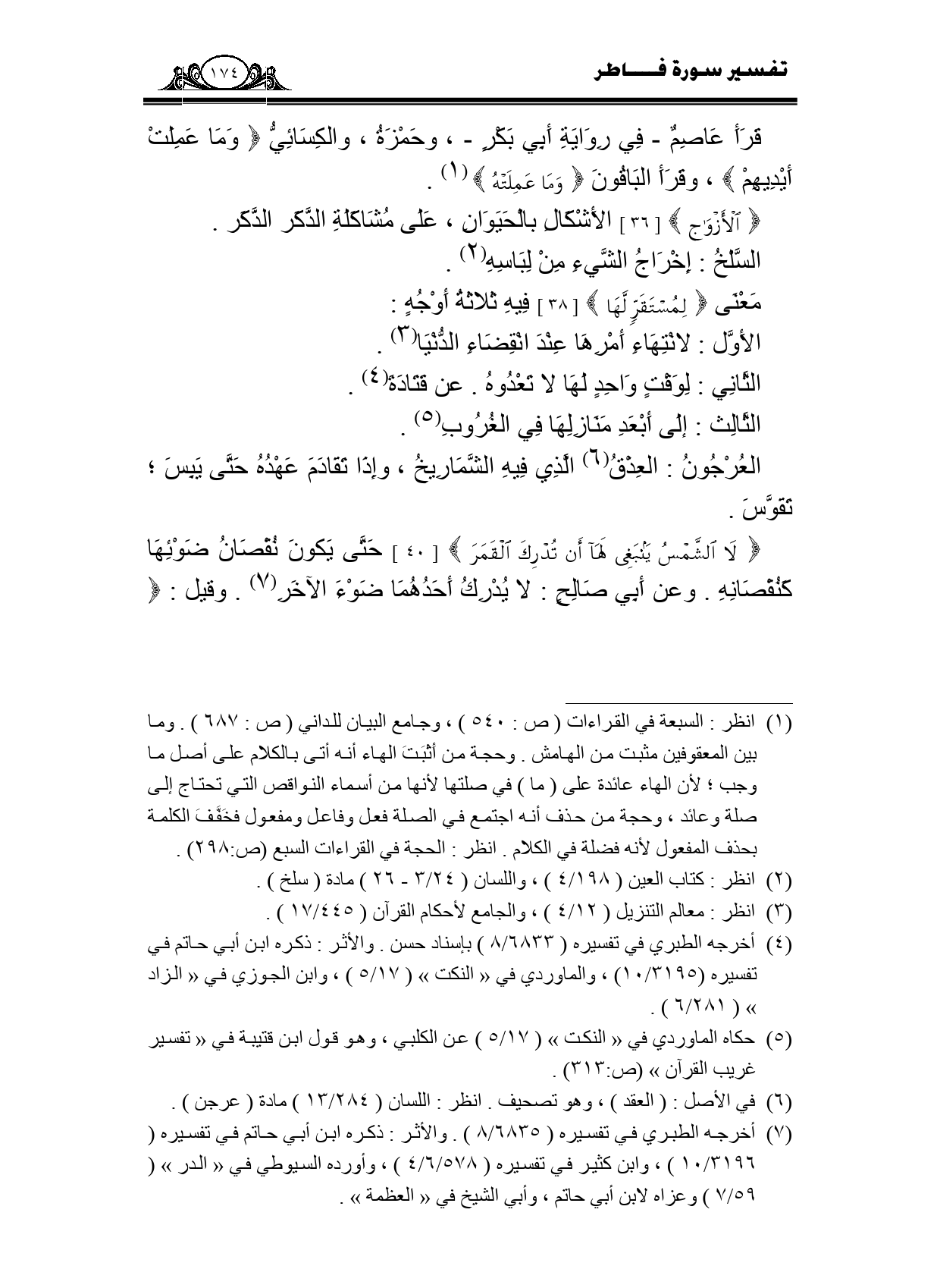 قرأ عاصم - في رواية أبي بكر -، وحمزة، والكسائي {وَمَا عَمِلَتْ أَيْدِيهِمْ} ، وقرأ الباقون {وَمَا عَمِلَتْهُ} .