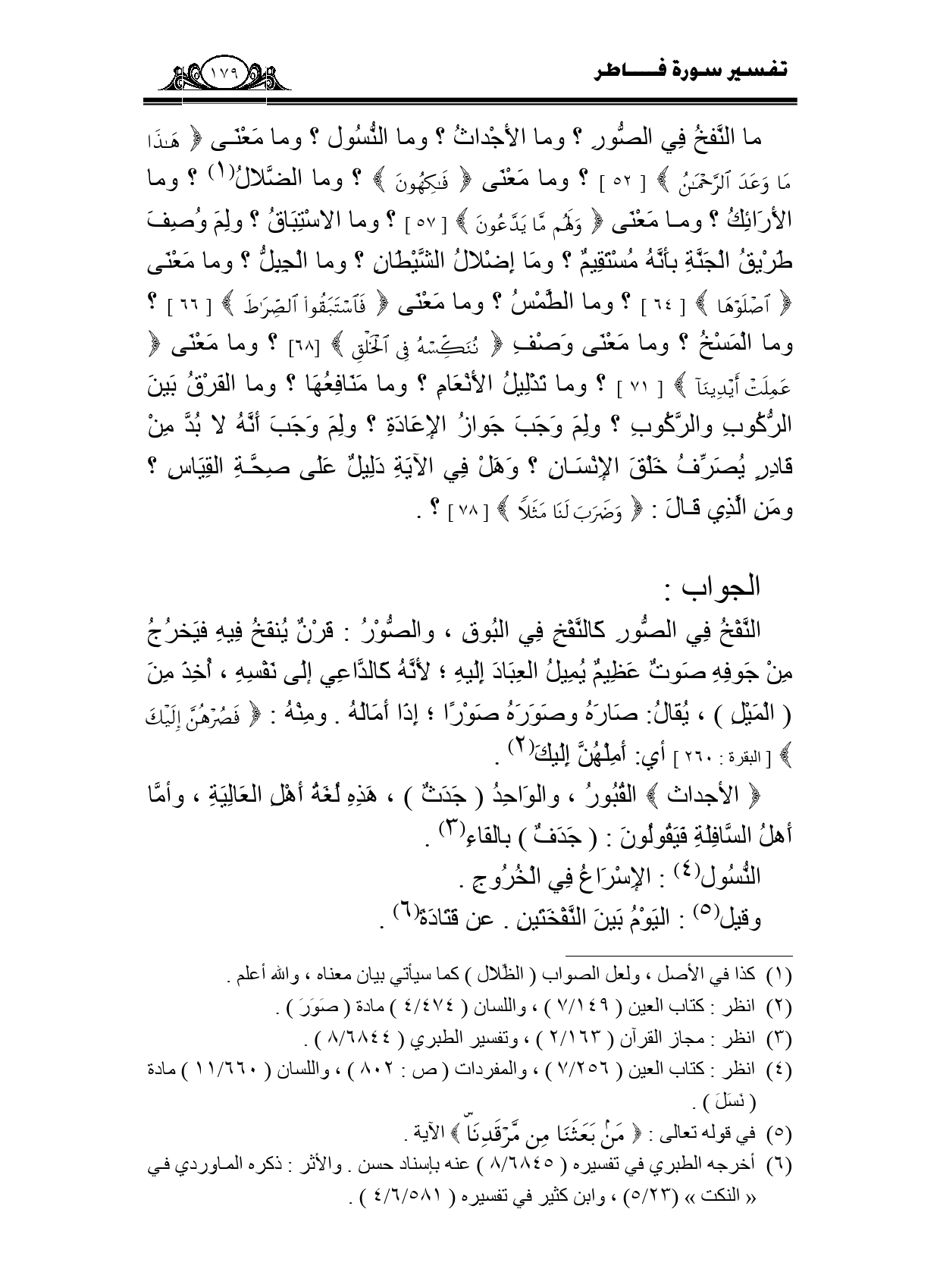 ما النفخ في الصور؟ وما الأجداث؟ وما النسول؟ وما معنى {مَا وَعَدَ الرَّحْمَنُ} [52] ؟ وما معنى {فَاكِهُونَ} ؟ وما الضلال؟ وما الأرائك؟ وما معنى {وَلَهُمْ مَا يَدَّعُونَ} [57] ؟ وما الاستباق؟ ولم وصف طريق الجنة بأنه مستقيم؟ وما إضلال الشيطان؟ وما الجبل؟ وما معنى {اصْلَوْهَا} [64] ؟ وما الطمس؟ وما معنى {فَاسْتَبَقُوا الصِّرَاطَ} [66] ؟ وما المسخ؟ وما معنى وصف {نُنَكِّسْهُ فِي الْخَلْقِ} [68] ؟ وما معنى {عَمِلَتْ أَيْدِينَا} [71] ؟ وما تذليل الأنعام؟ وما منافعها؟ وما الفرق بين الركون والركوب؟ ولم وجب جواز الإعادة؟ ولم وجب أنه لا بد من قادر يصرف خلق الإنسان؟ وهل في الآية دليل على صحة القياس؟ ومن الذي قال: {وَضَرَبَ لَنَا مَثَلًا} [78] ؟