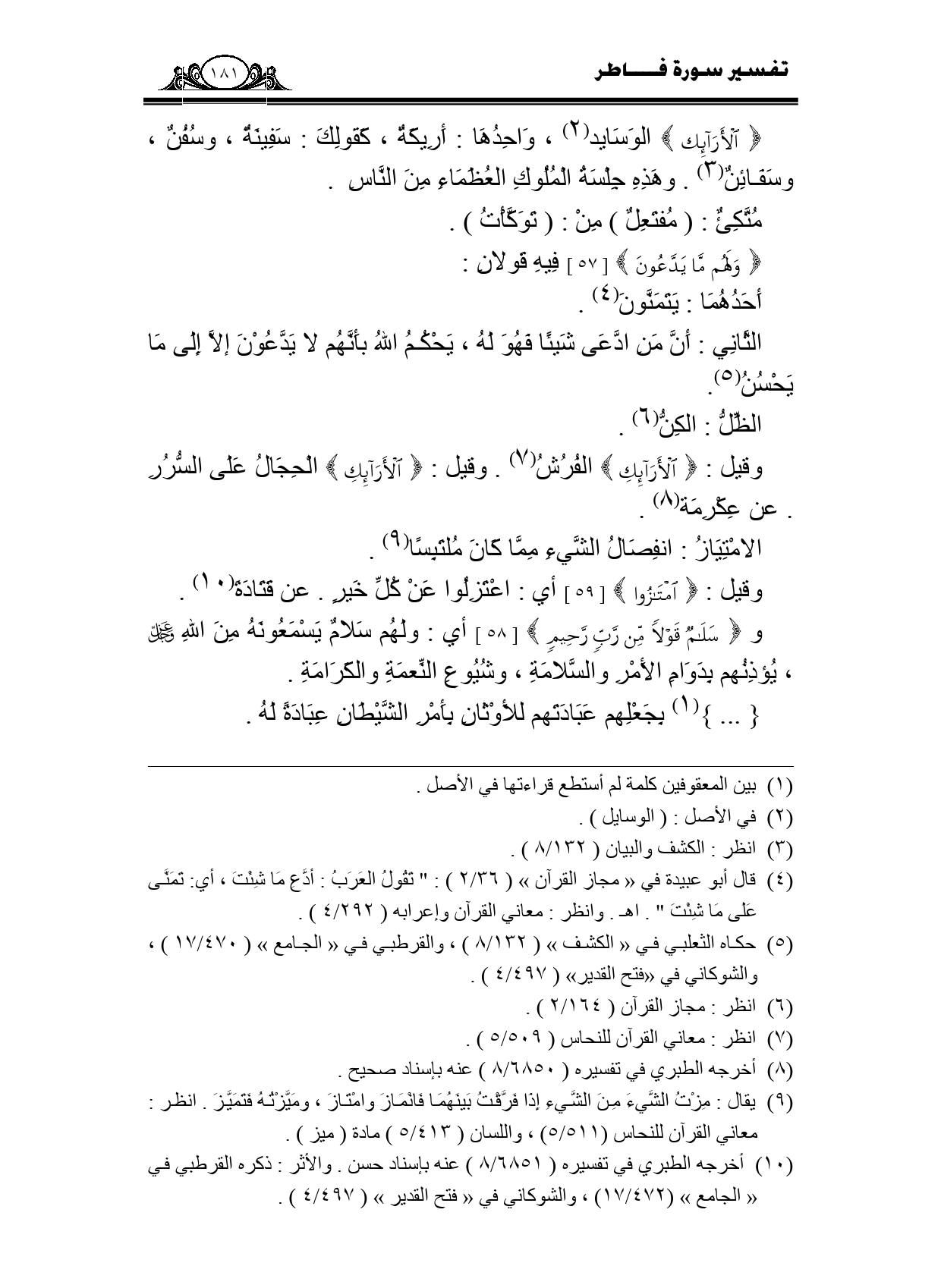 {الْأَرَائِكِ} الوسايد، واحدها: أريكة، كقولك: سفينة، وسفن، وسفانن. وهذه جلسة الملوك العظماء من الناس.