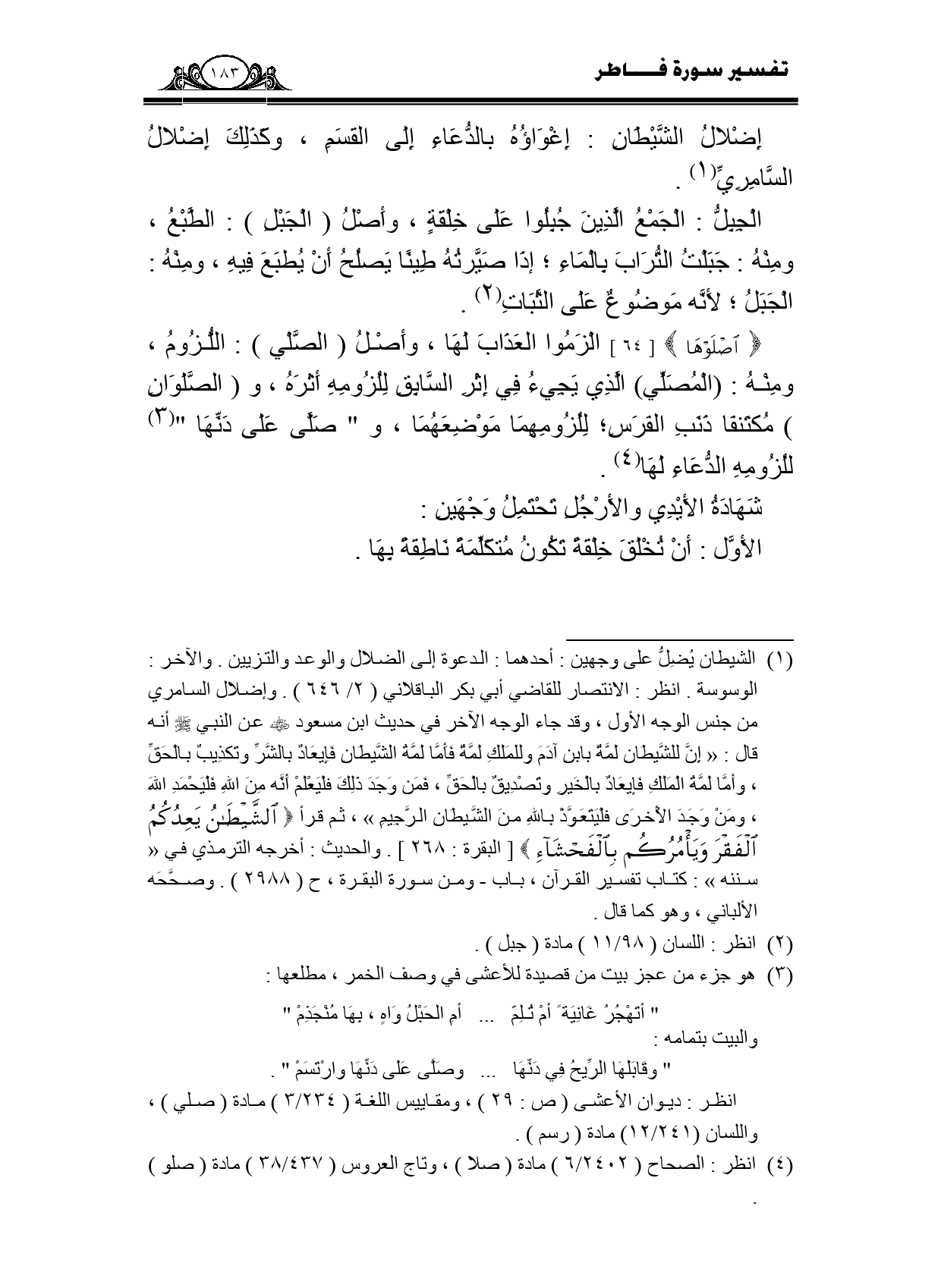 {اصْلَوْهَا} [64] الزموا العذاب لها، وأصل (الصلي) : اللزوم، ومنه: (المصلي) الذي يجيء في إثر السابق للزومه أثره، و (الصلوان) مكتنفا ذنب الفرس؛ للزومهما موضعهما، و"صلى على دنها" للزومه الدعاء لها.