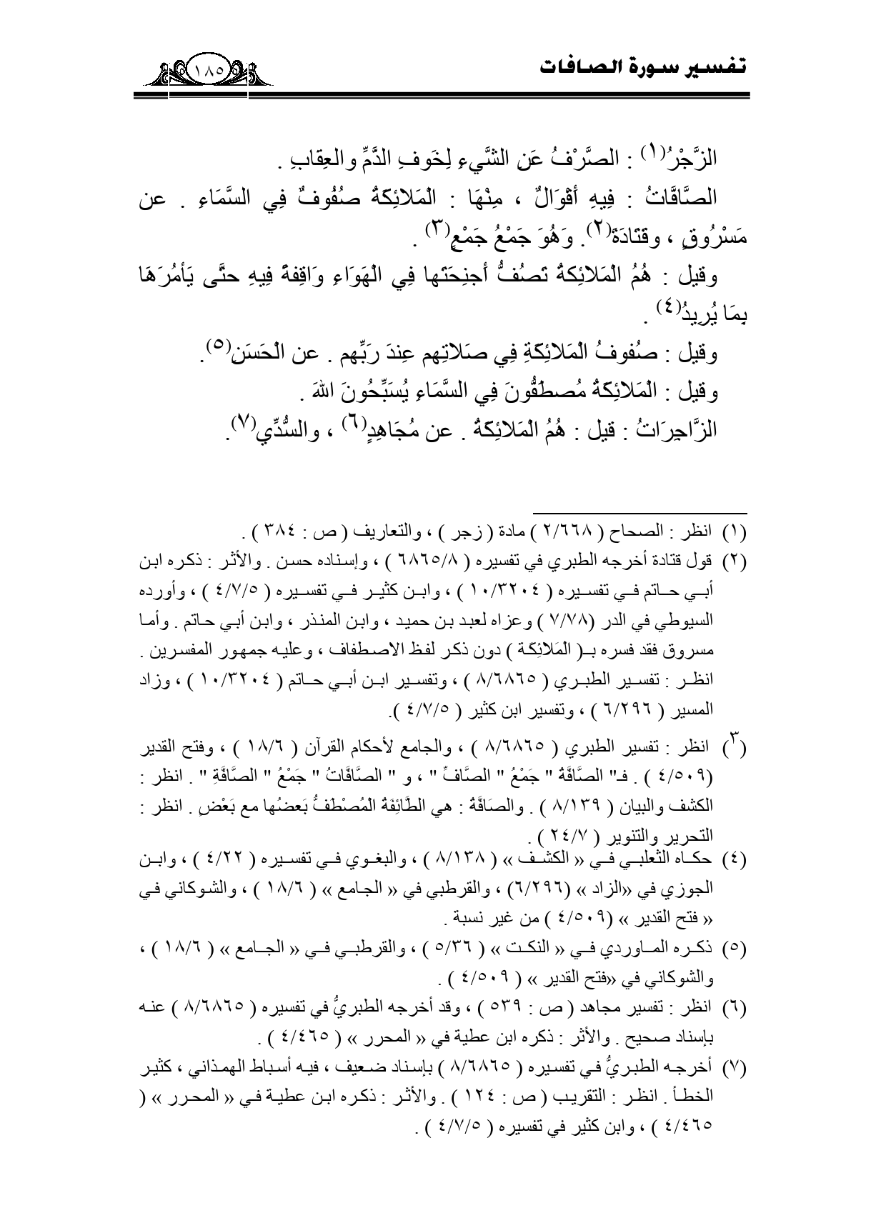الصافات: فيه أقوال، منها: الملائكة صفوف في السماء. عن مسروق، وقتادة. وهو جمع جمع.