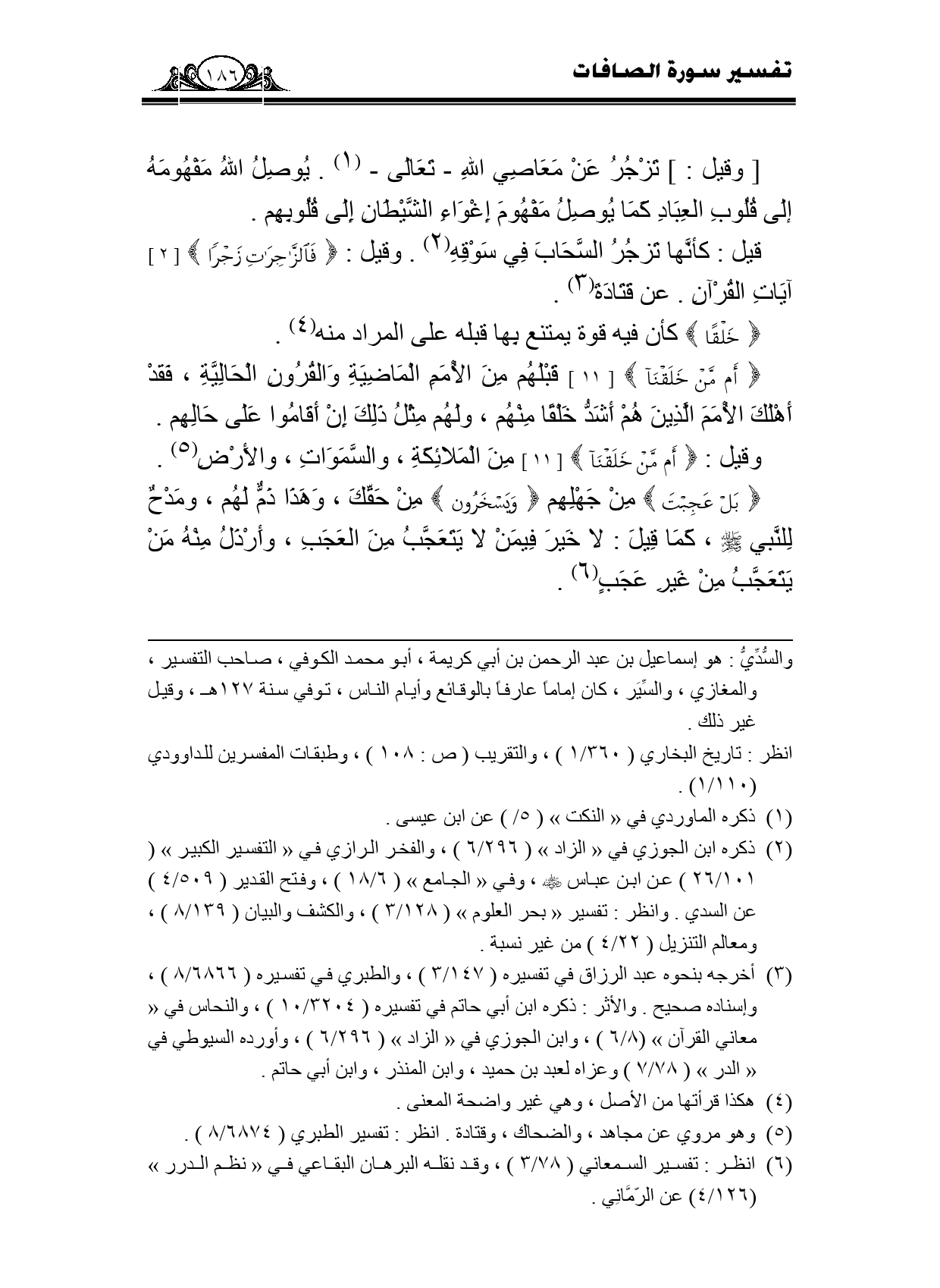 وقيل: {أَمْ مَنْ خَلَقْنَا} [11] من الملائكة، والسموات، والأرض. {بَلْ عَجِبْتَ} من جهلهم {وَيَسْخَرُونَ} من حقك، وهذا ذم لهم، ومدح للنبي - صلى الله عليه وسلم -، كما قيل: لا خير فيمن لا يتعجب من العجب، وأرذل منه من يتعجب من غير عجب.