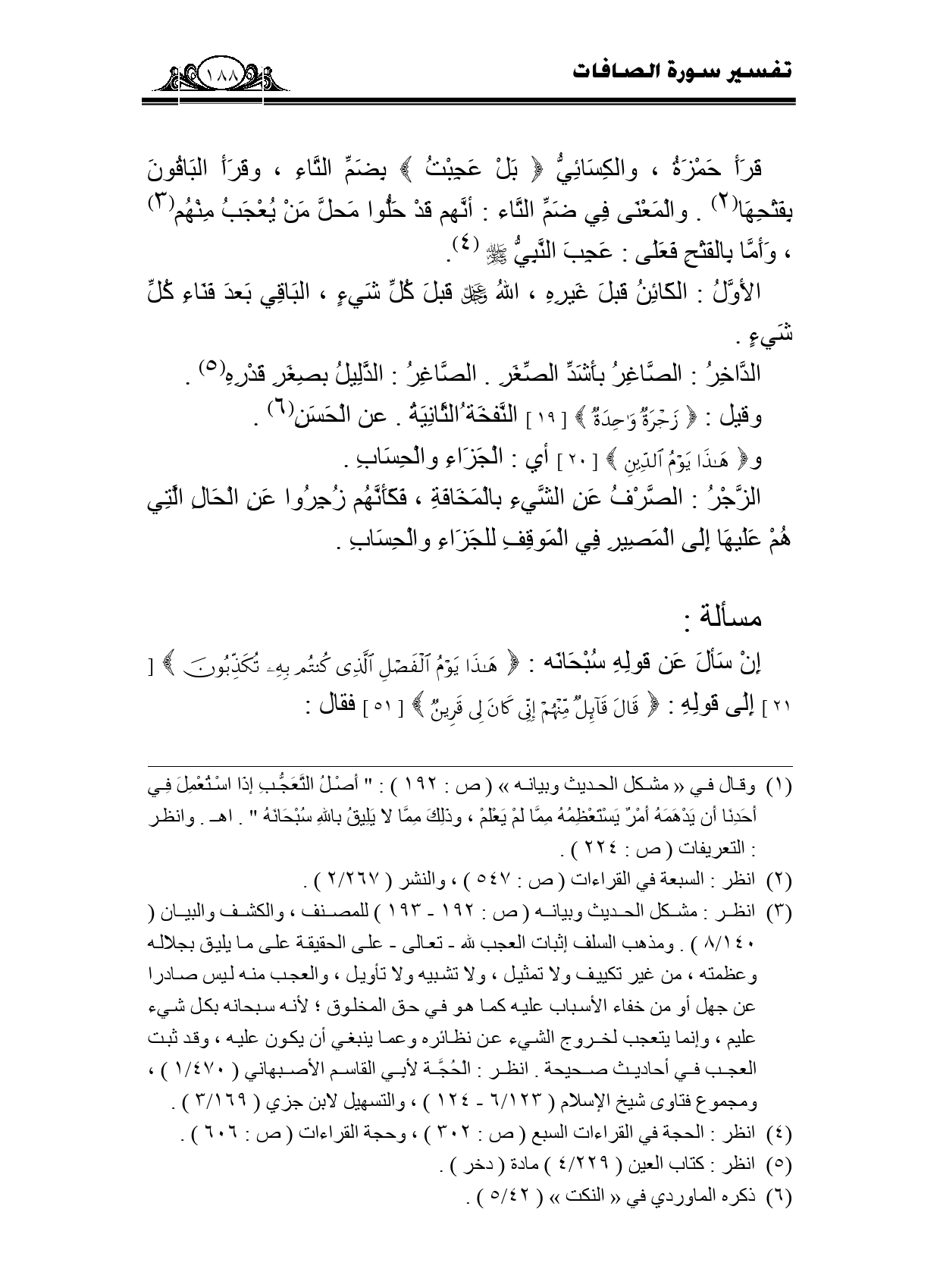 قرأ حمزة، والكسائي {بَلْ عَجِبْتَ} بضم التاء، وقرأ الباقون بفتحها. والمعنى في ضم التاء: أنهم قد حلوا محل من يعجب منهم، وأما بالفتح فعلى: عجب النبي - صلى الله عليه وسلم -.