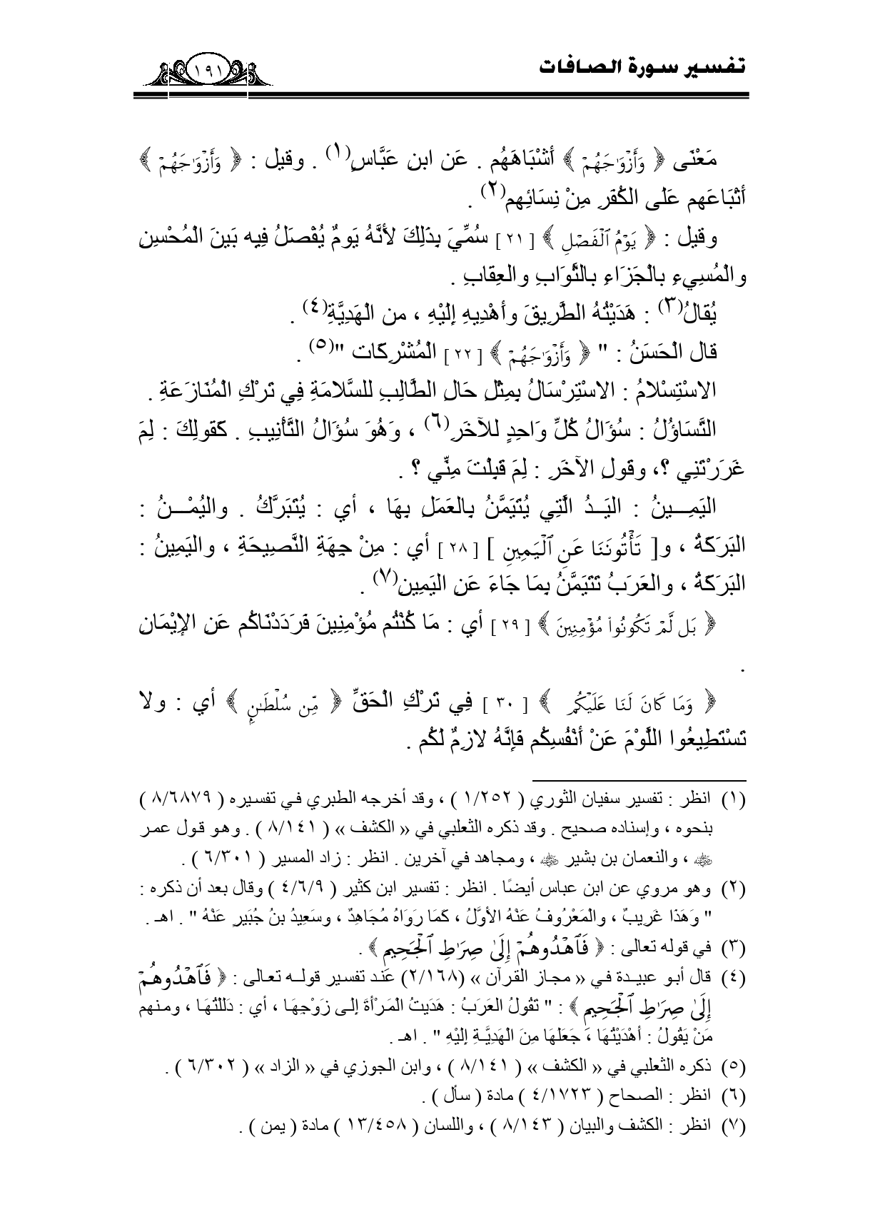 معنى {وَأَزْوَاجِهِمْ} أشباههم. عن ابن عباس. وقيل: {وَأَزْوَاجِهِمْ} أتباعهم على الكفر من نسائهم.