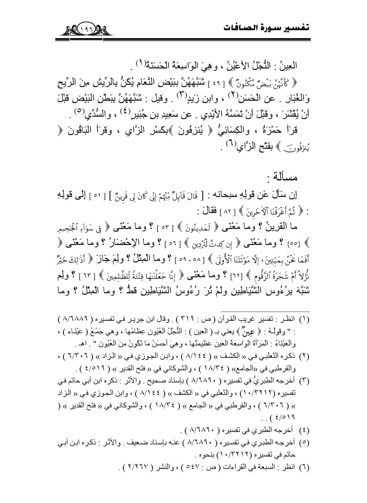 ما القرينُ؟ وما معنى {لَمَدِينُونَ} [53] ؟ وما معنى {فِي سَوَاءِ الْجَحِيمِ} [55] ؟ وما معنى {إِنْ كِدْتَ لَتُرْدِينِ} [56] ؟ وما الإحضارُ؟ وما معنى {أَفَمَا نَحْنُ بِمَيِّتِينَ (58) إِلَّا مَوْتَتَنَا الْأُولَى} [58 - 59] ؟ وما المثلُ؟ ولم جاز {أَذَلِكَ خَيْرٌ نُزُلًا أَمْ شَجَرَةُ الزَّقُّومِ} [62] ؟ وما معنى {إِنَّا جَعَلْنَاهَا فِتْنَةً لِلظَّالِمِينَ} [63] ؟ ولم شبه برءوس الشياطين ولم ترَ رءوس الشياطين قط؟ وما المثل؟ وما