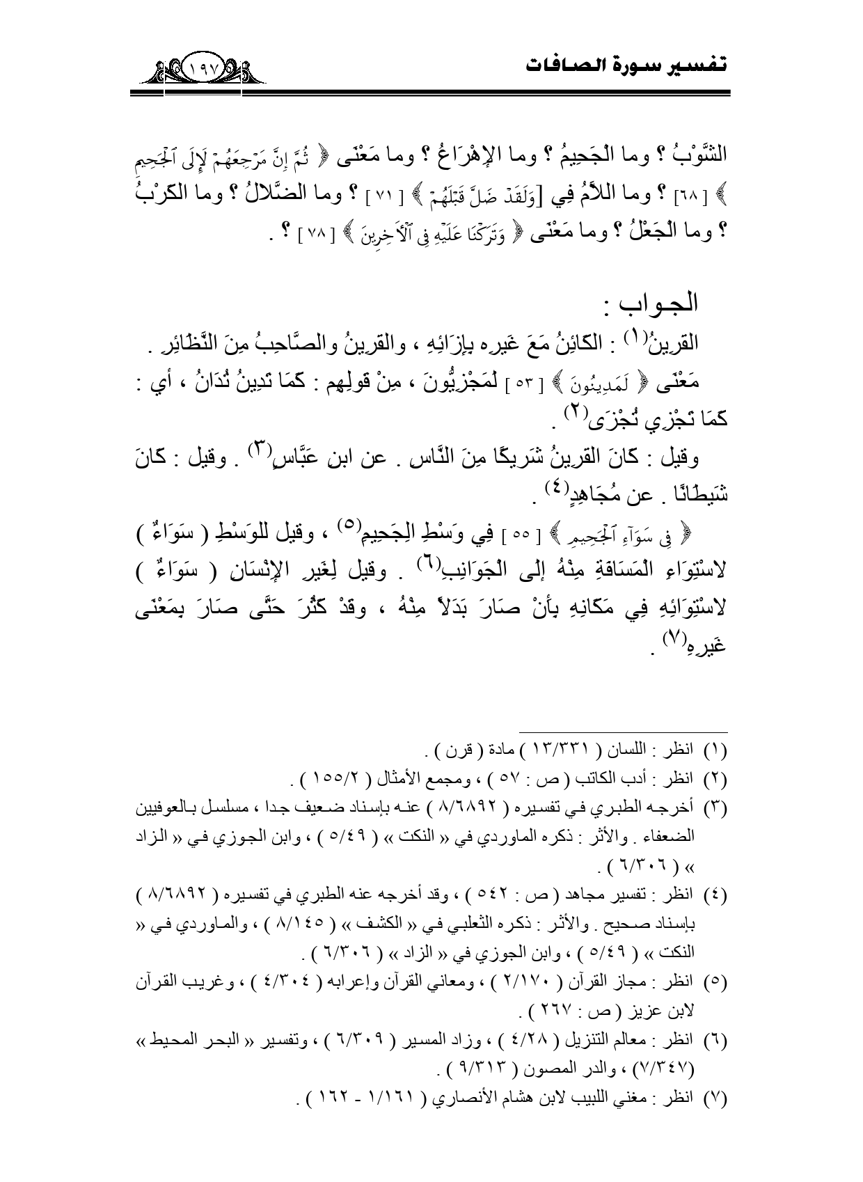الشوبُ؟ وما الجحيم؟ وما الإهراع؟ وما معنى {ثُمَّ إِنَّ مَرْجِعَهُمْ لَإِلَى الْجَحِيمِ} [68] ؟ وما اللام في {وَلَقَدْ ضَلَّ قَبْلَهُمْ} [71] ؟ وما الضلالُ؟ وما الكرب؟ وما الجعْلُ؟ وما معنى {وَتَرَكْنَا عَلَيْهِ فِي الْآخِرِينَ} [78] ؟.