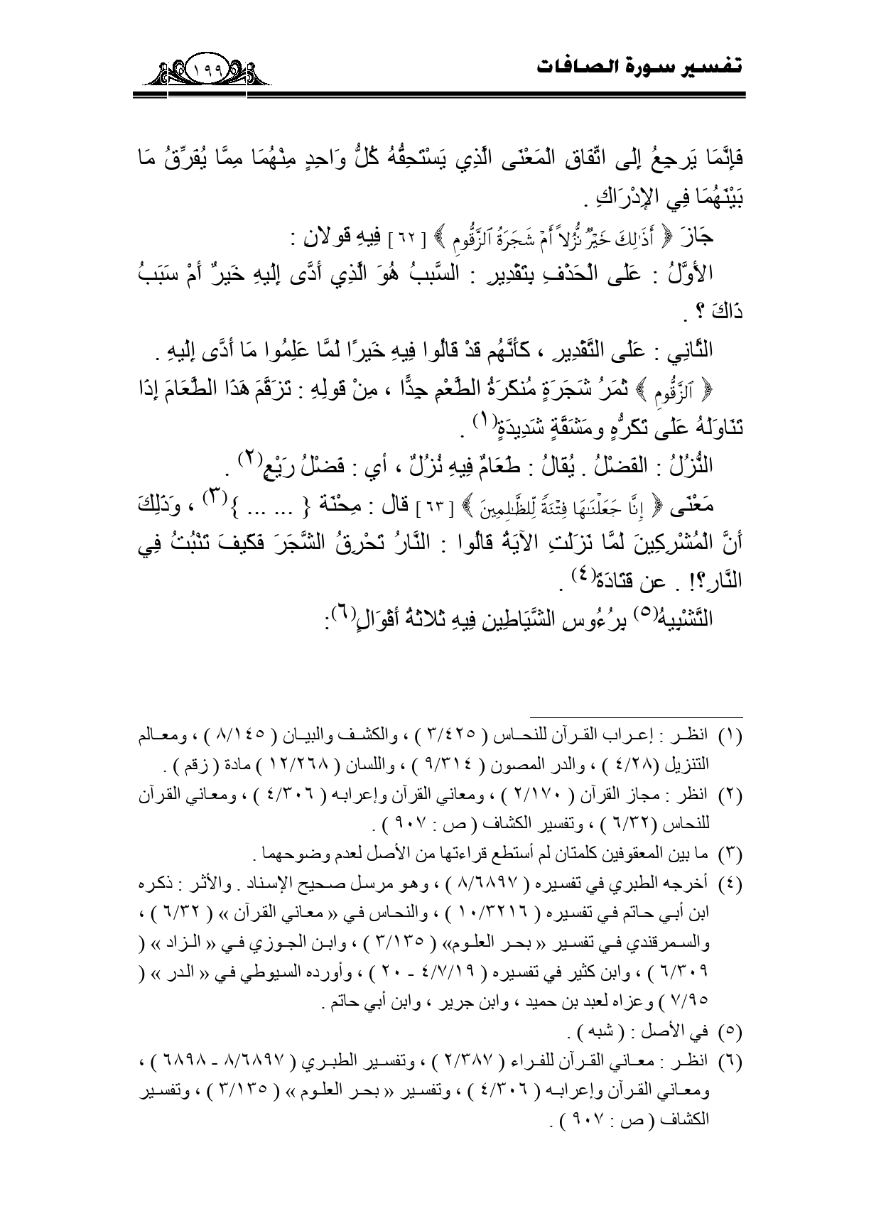 الثاني: على التقدري، كأنهم قد قالوا فيه خيراً لما علموا ما أدى إليه. {الزَّقُّومِ} تمر شجرة منكرة الطعم جداً، من قوله: تزقم هذا الطعلم إذا تناوله على تكرهٍ ومشقة شديدة.