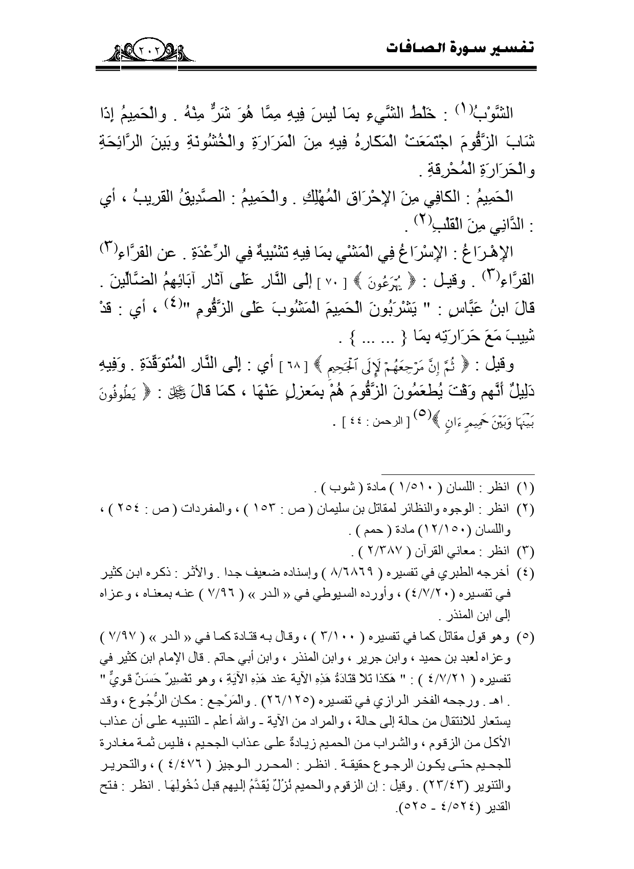 الإهراعُ: الإسراع في المشي بما فيه تشبيه في الرغدة. عن الفراءِ الفراء. وقيل: {يُهْرَعُونَ} [70] إلى النار على آثار آبائهم الضالين. قال ابن عباس: "يشربون الحميم المشوب على الزقزم"، أي: قد سيبَ مع حرارته بما {.....} .