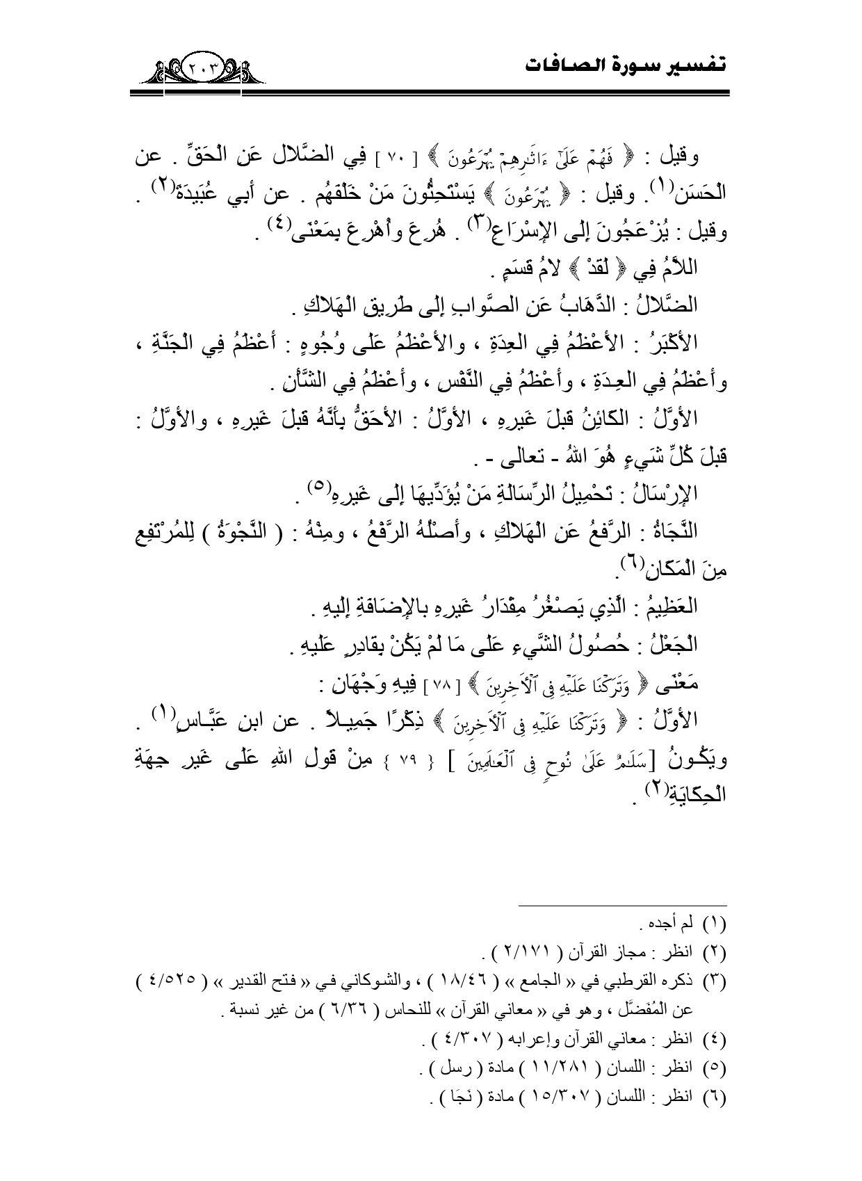 وقيل: {فَهُمْ عَلَى آثَارِهِمْ يُهْرَعُونَ} [70] في الضلال عن الحق. عن الحسن. وقيل: {يُهْرَعُونَ} يستحثون من خلفهم. عن أبي عبيدة. وقيل: يزعجون إلى الإسراع. هرع وأهرعَ بمعنَى.