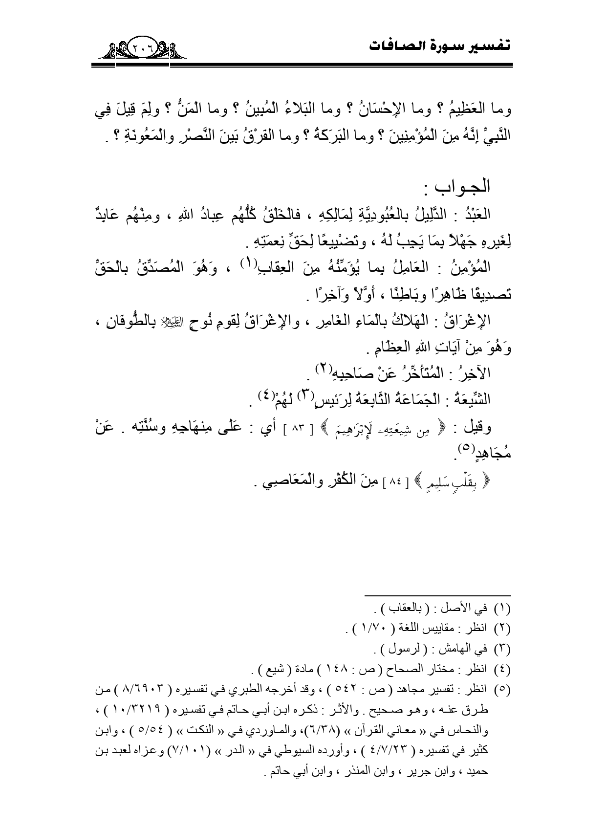 وما العظيم؟ وما الإحسان؟ وما البلاء المبين؟ وما المنُّ؟ ولم قيل في النبي إنه من المؤمنين؟ وما البركة؟ وما الفرق بين النصر والمعونة؟.