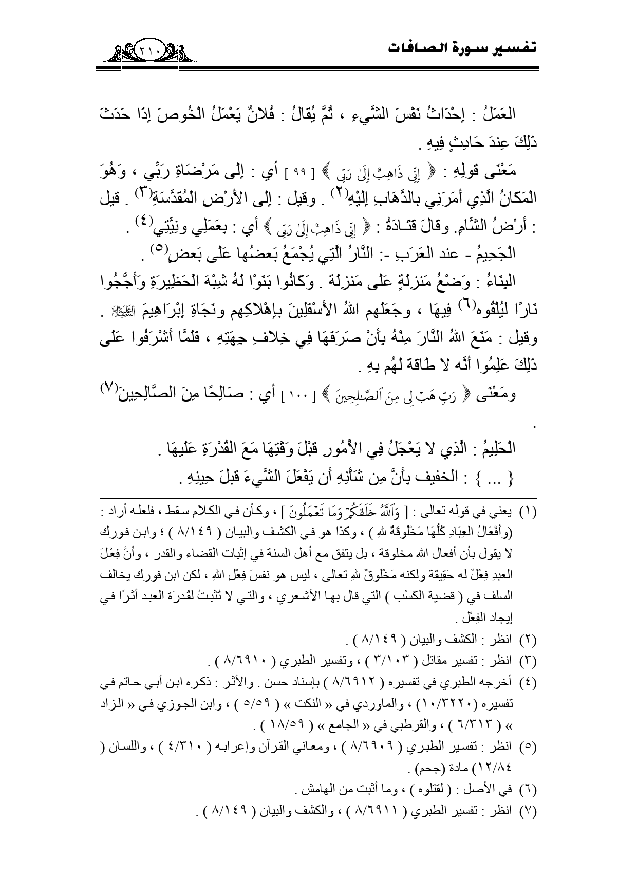 معنى قوله: {إِنِّي ذَاهِبٌ إِلَى رَبِّي} [99] أي: إلى مرضاة ربي، وهو المكان الذي أمرني بالذهاب إليه. وقيل: إلى الأرض المقدسة. قيل: أرض الشام. وقال قتادة {إِنِّي ذَاهِبٌ إِلَى رَبِّي} أي: بعملي ونيتي.