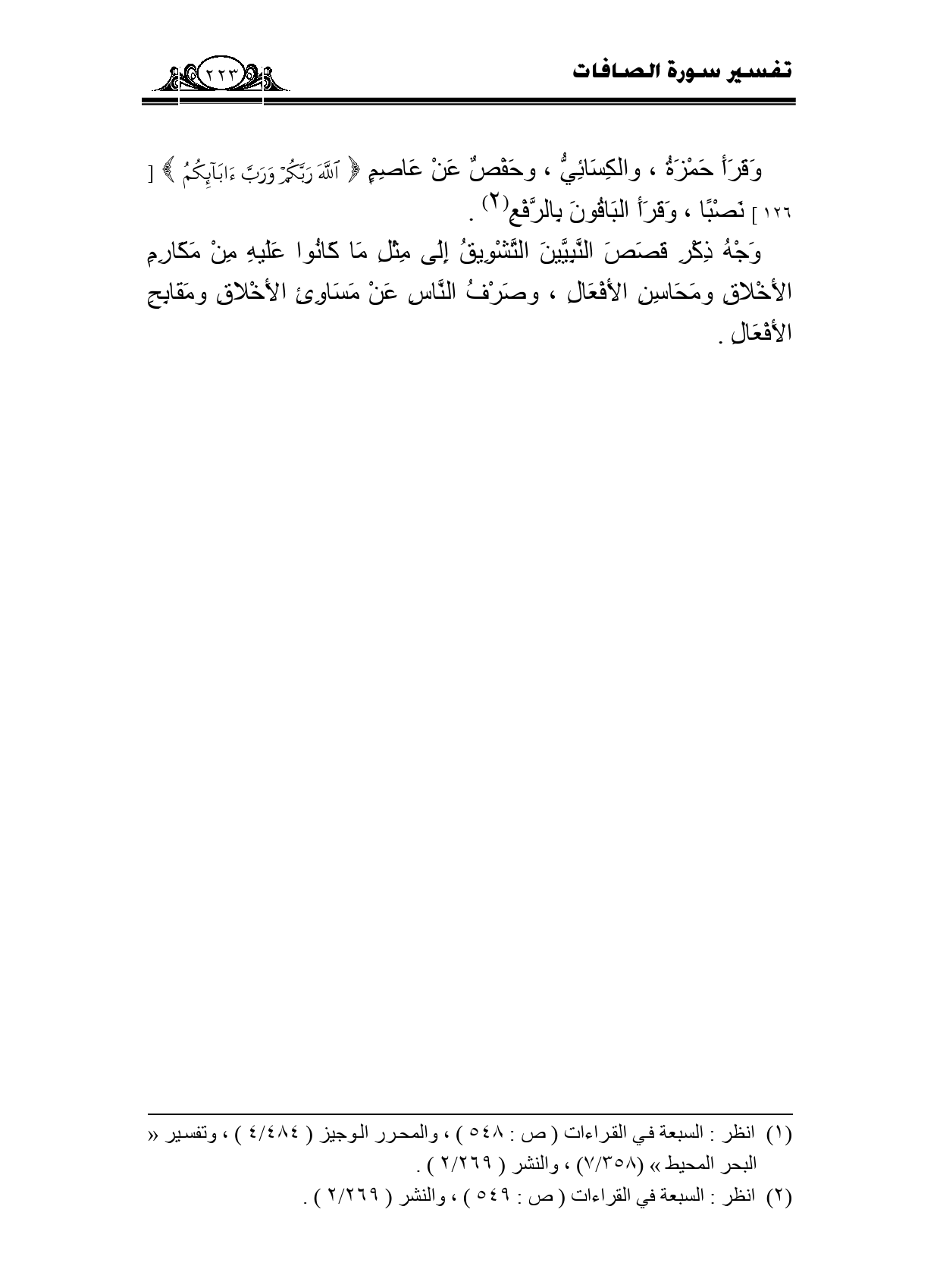 وقرأ حمزة، والكسائي، وحفص عن عاصم {اللَّهَ رَبَّكُمْ وَرَبَّ آبَائِكُمُ} [126] نصباً، وقرأ الباقون بالرفع.