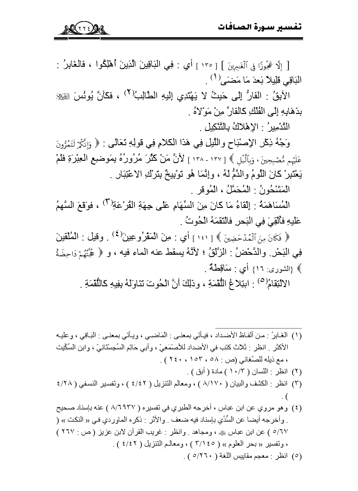 {إِلَّا عَجُوزًا فِي الْغَابِرِينَ} [135] أي: في الباقين الذين أهلكوا، فالغابرُ: الباقي قليلاً بعد ما مضى.
