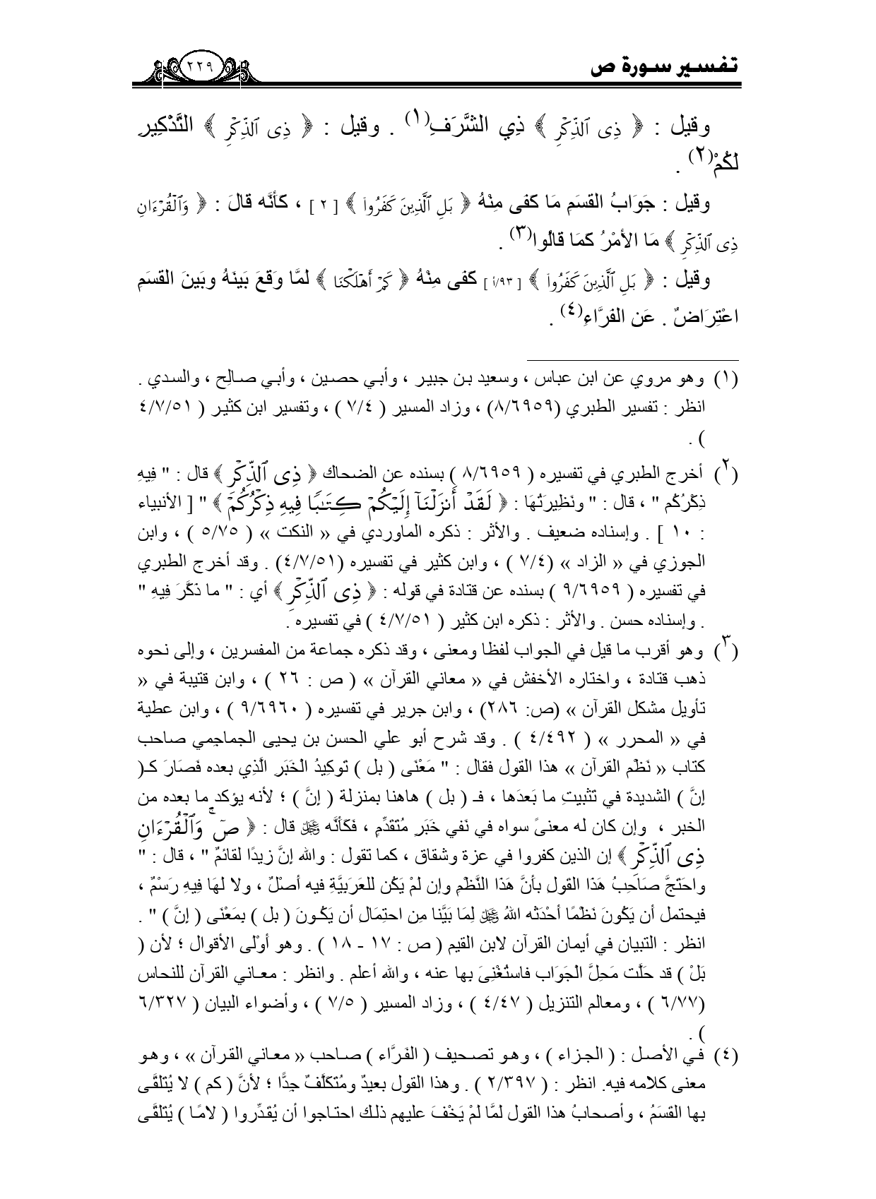 وقيل: جواب القسم ما كفى منه {بَلِ الَّذِينَ كَفَرُوا} [2] ، كأنه قال: {وَالْقُرْآنِ ذِي الذِّكْرِ} ما الأمر كما قالوا.
