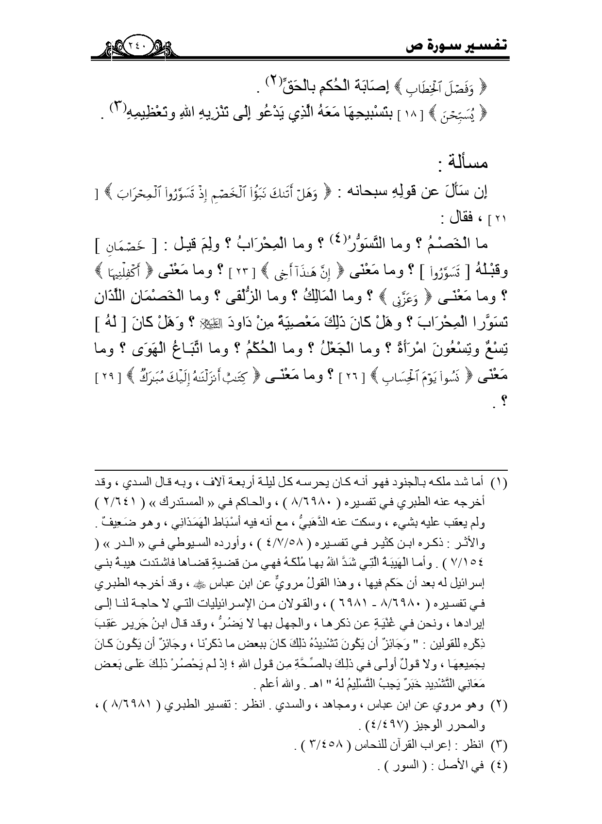 ما الخصمُ؟ وما التسوُّرُ؟ وما المحرابُ؟ ولم قيل: [خَصْمَانِ] وقبلهُ [تَسَوَّرُوا] ؟ وما معنى {إِنَّ هَذَا أَخِي} [23] ؟ وما معنى {أَكْفِلْنِيهَا} ؟ وما معنى {وَعَزَّنِي} ؟ وما المالك؟ وما الزلفى؟ وما الخصمان اللذان تسورا المحرابِ؟ وهل كان ذلك معصية من داود - عليه السلام -؟ وهل كان [لهُ] تسع وتسعون امرأة؟ وما الجعْلُ؟ وما الحكمُ؟ وما اتباع الهوى؟ وما معنى {نَسُوا يَوْمَ الْحِسَابِ} [26] ؟ وما معنى {كِتَابٌ أَنْزَلْنَاهُ إِلَيْكَ مُبَارَكٌ} [29] ؟.