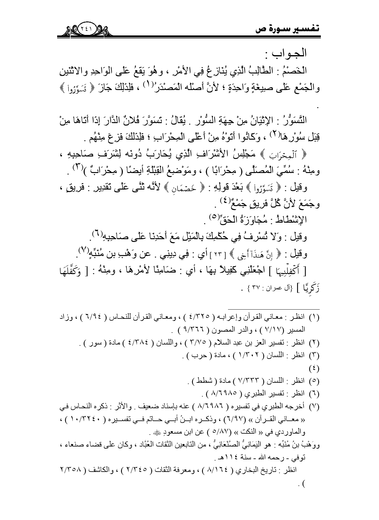 الخصمُ: الطالب الذي ينازع في الأمر، وهو يقع على الواحد والاثنين والجمع على صيغة واحدةٍ، لأن أصله المصدر، فذلك جاز {تَسَوَّرُوا} .