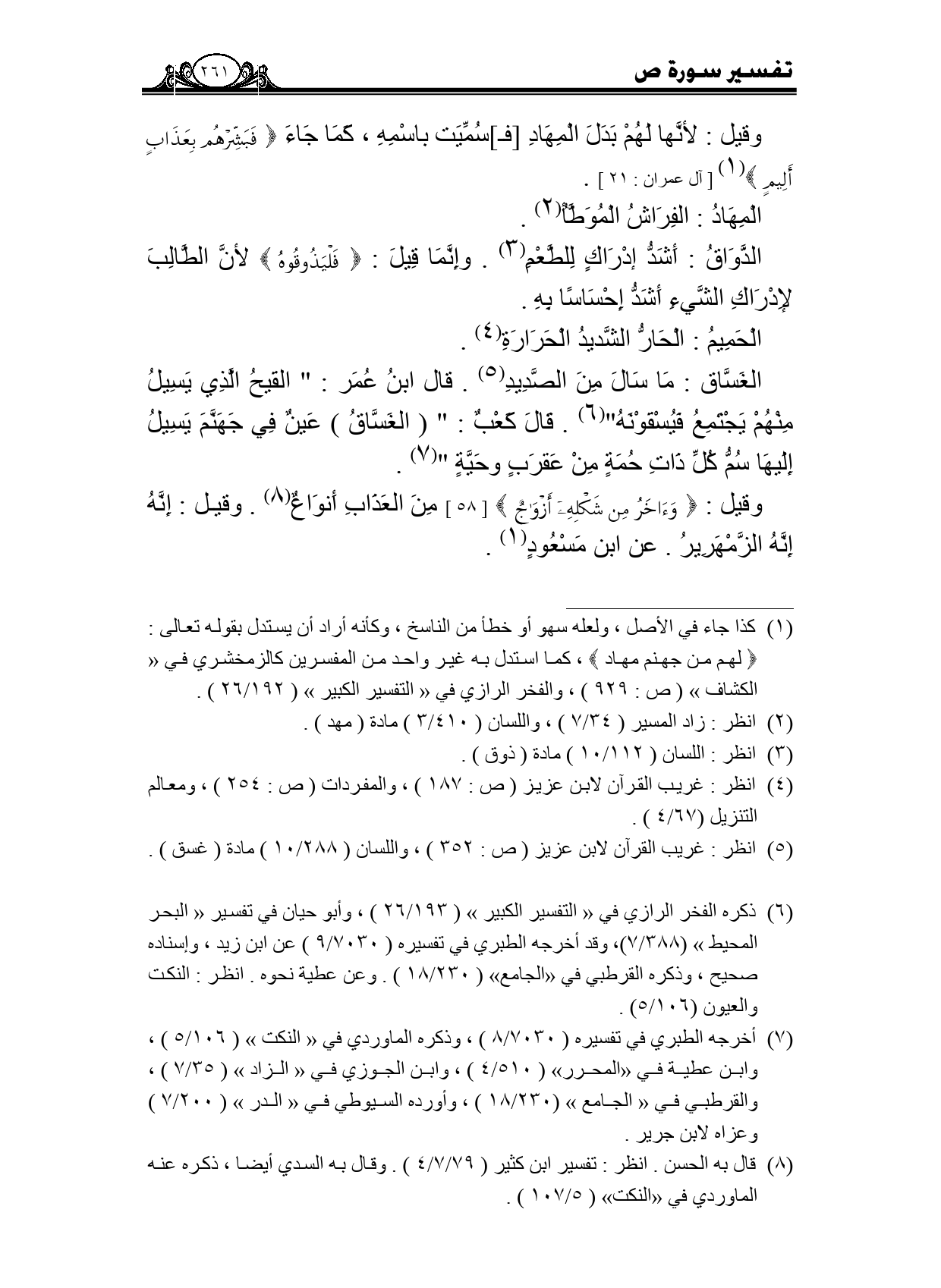 الغساق: ما سال من الصديد. قال ابن عمر: "القيح الذي يسيل منهم يجتمع فيقونه". قال كعب: " (الغساق) عين في جهنم يسيل إليها سم كل ذات حمة من عقرب وحية".