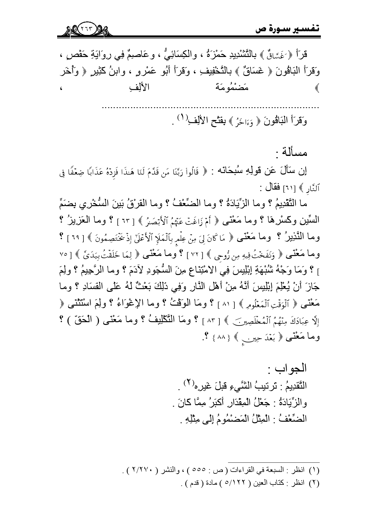 ما التقديم؟ وما الزيادة؟ وما الضعف؟ وما الفرق بين السخري بضم السين وكسرها؟ وما معنى {أَمْ زَاغَتْ عَنْهُمُ الْأَبْصَارُ} [63] ؟ وما العزيز؟ وما النذير؟ وما معنى {مَا كَانَ لِيَ مِنْ عِلْمٍ بِالْمَلَإِ الْأَعْلَى إِذْ يَخْتَصِمُونَ} [69] ؟ وما معنى {وَنَفَخْتُ فِيهِ مِنْ رُوحِي} [72] ؟ وما معنى {لِمَا خَلَقْتُ بِيَدَيَّ} [75] ؟ وما وجه شبهة إبليس في الامتناع من السجود لآدم؟ وما الرجيم؟ ولم جز أن يعلم إبليس أنه من أهل النار وفي ذلك بعث له على الفساد؟ وما معنى {الْوَقْتِ الْمَعْلُومِ} [81] ؟ وما الوقت؟ وما الإغواء؟ ولم استثنى {إِلَّا عِبَادَكَ مِنْهُمُ الْمُخْلَصِينَ} [83] ؟ وما التكليف؟ وما معنى (الحق) ؟ وما معنى {بَعْدَ حِينٍ} [88] ؟
