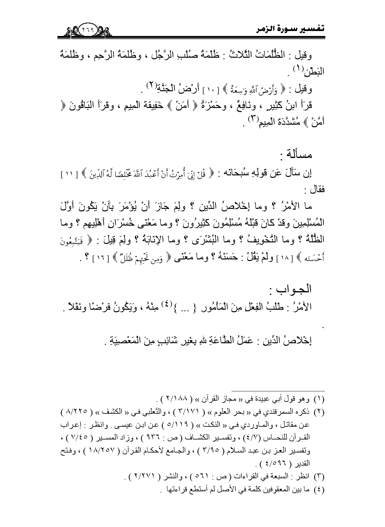 ما الأمر؟ وما إخلاص الدين؟ ولم جاز أن يؤمر بأن يكون أول المسلمين وقد كان قبله مسلمون كثيرون؟ وما معنى خسران أهليهم؟ وما الظلة؟ وما التخويف؟ وما البشرى؟ وما الإنابة؟ ولم قيل: {فَيَتَّبِعُونَ أَحْسَنَهُ} [18] ولم يقل: حسنه؟ وما معنى {وَمِنْ تَحْتِهِمْ ظُلَلٌ} [16] ؟