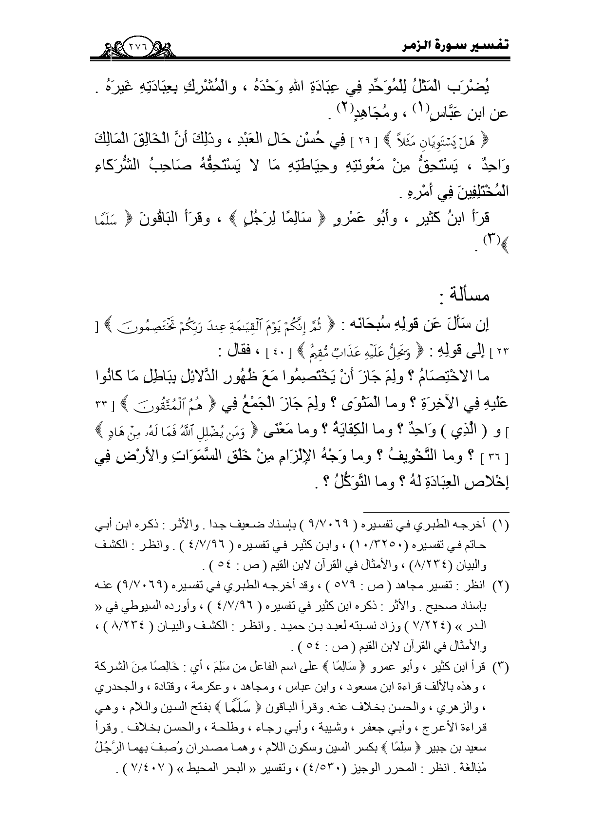 ما الاختصام؟ ولم جاز أن يختصموا مع ظهور الدلائل بباطل ما كانوا عليه في الآخرة؟ وما المثوى؟ ولم جاز الجمع في {هُمُ الْمُتَّقُونَ} [33] و (الذي) واحد؟ وما الكفاية؟ وما معنى {وَمَنْ يُضْلِلِ اللَّهُ فَمَا لَهُ مِنْ هَادٍ} [36] ؟ وما التخويف؟ وما وجه الإلزام من خلق السموات والأرض في إخلاص العبادة له؟ وما التوكل؟