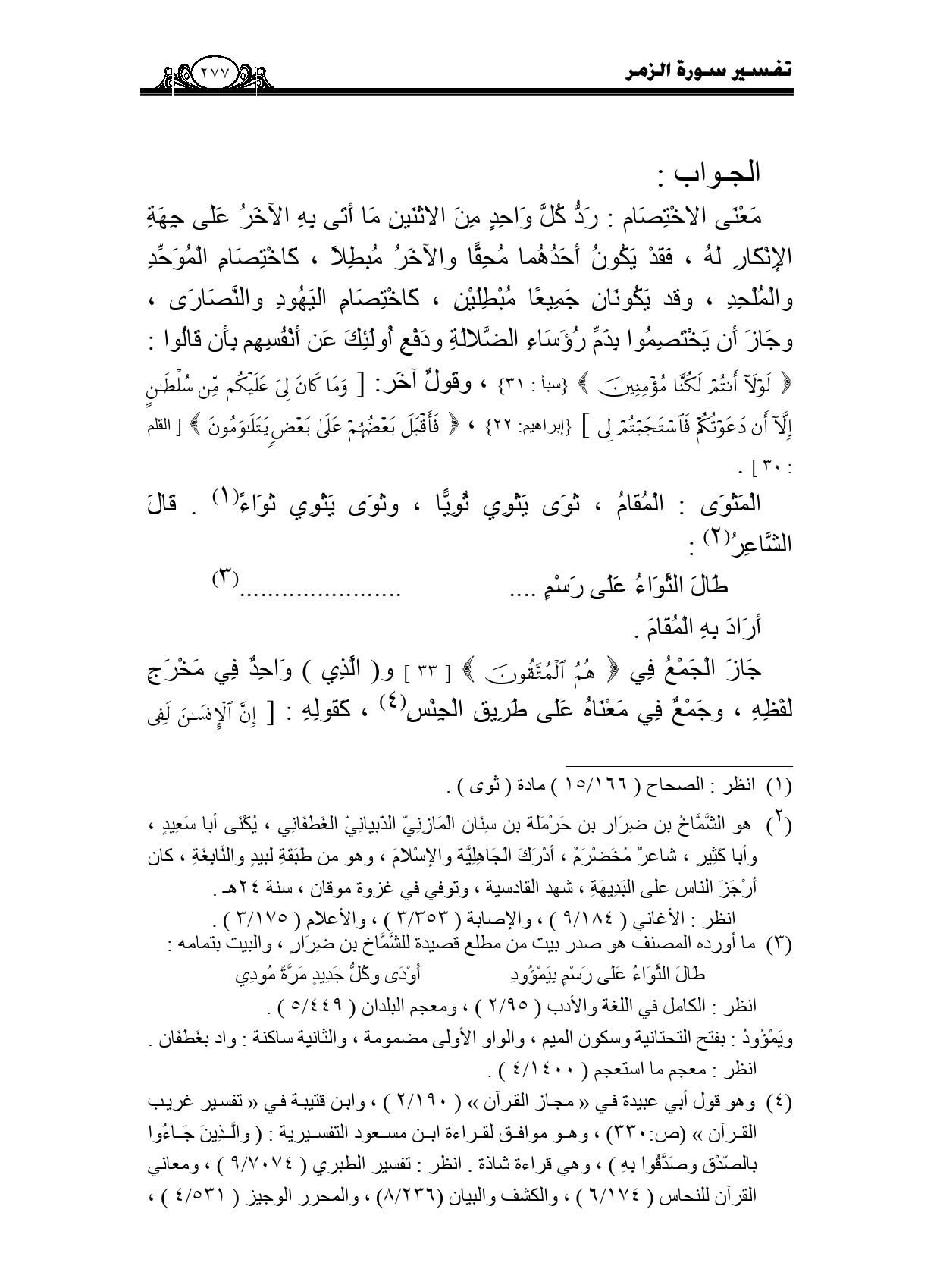 جاز الجمع في {هُمُ الْمُتَّقُونَ} [33] و (الذي) واحد في مخرج لفظه، وجمع في معناه على طريق الجنس، كقوله: {إِنَّ الْإِنْسَانَ لَفِي