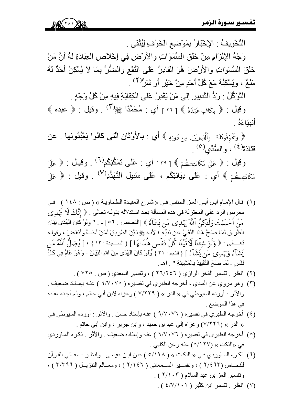وقيل: {بِكَافٍ عَبْدَهُ} [36] أي: محمد - صلى الله عليه وسلم -. وقيل: {عَبْدَهُ} أنبياءه.