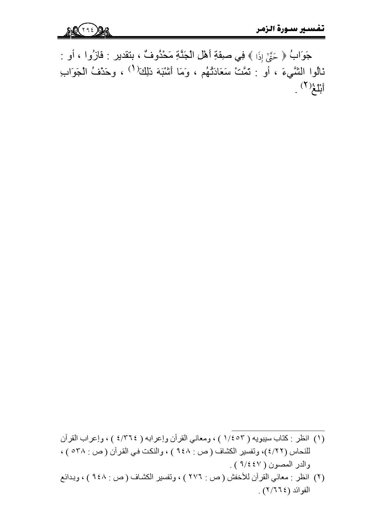 جواب {حَتَّى إِذَا} في صفة أهل الجنة محذوف، بتقدير: فازوا، أو: نالوا الشيء، أو: تمت سعادتهم، وما أشبه ذلك، وحذف الجواب أبلغ.