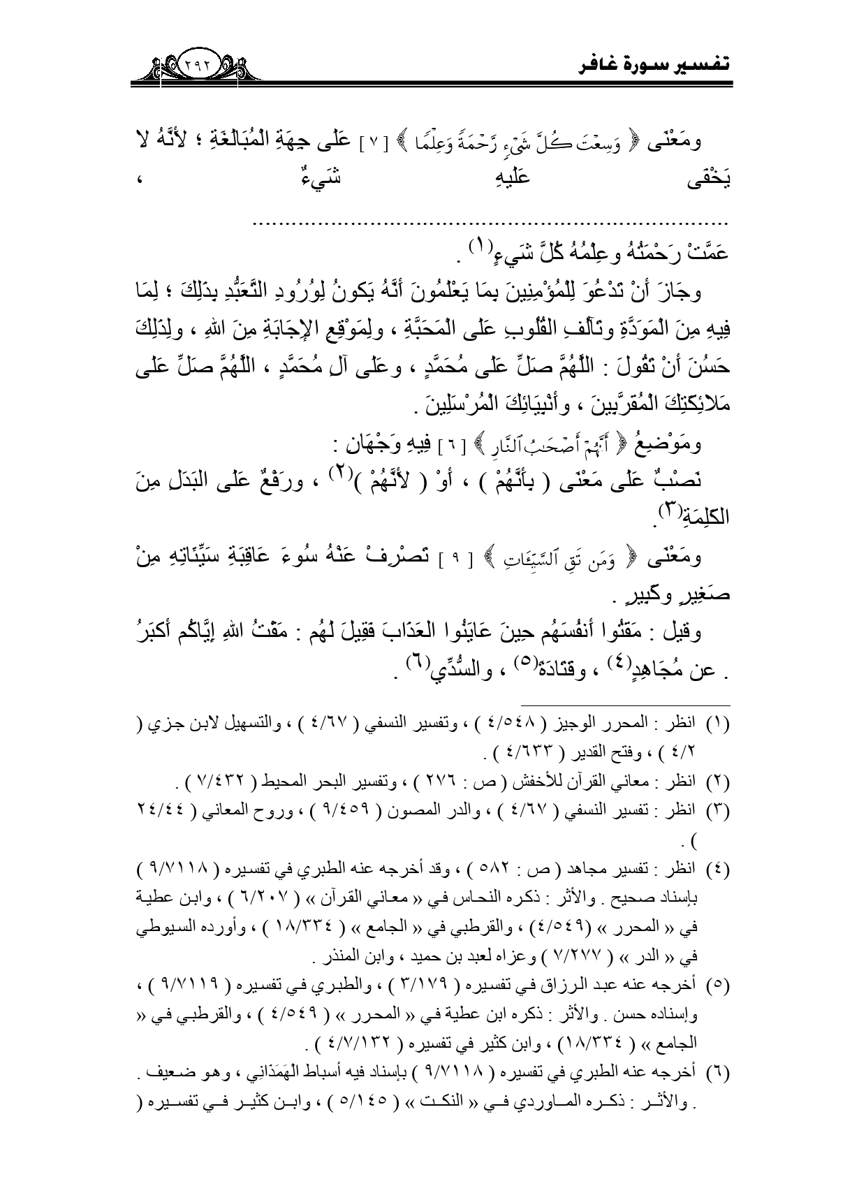 ومعنى {وَسِعْتَ كُلَّ شَيْءٍ رَحْمَةً وَعِلْمًا} [7] على جهة المبالغة؛ لأنه لا يخفى عليه شيء....... عمت رحمته وعلمه كل شيء.