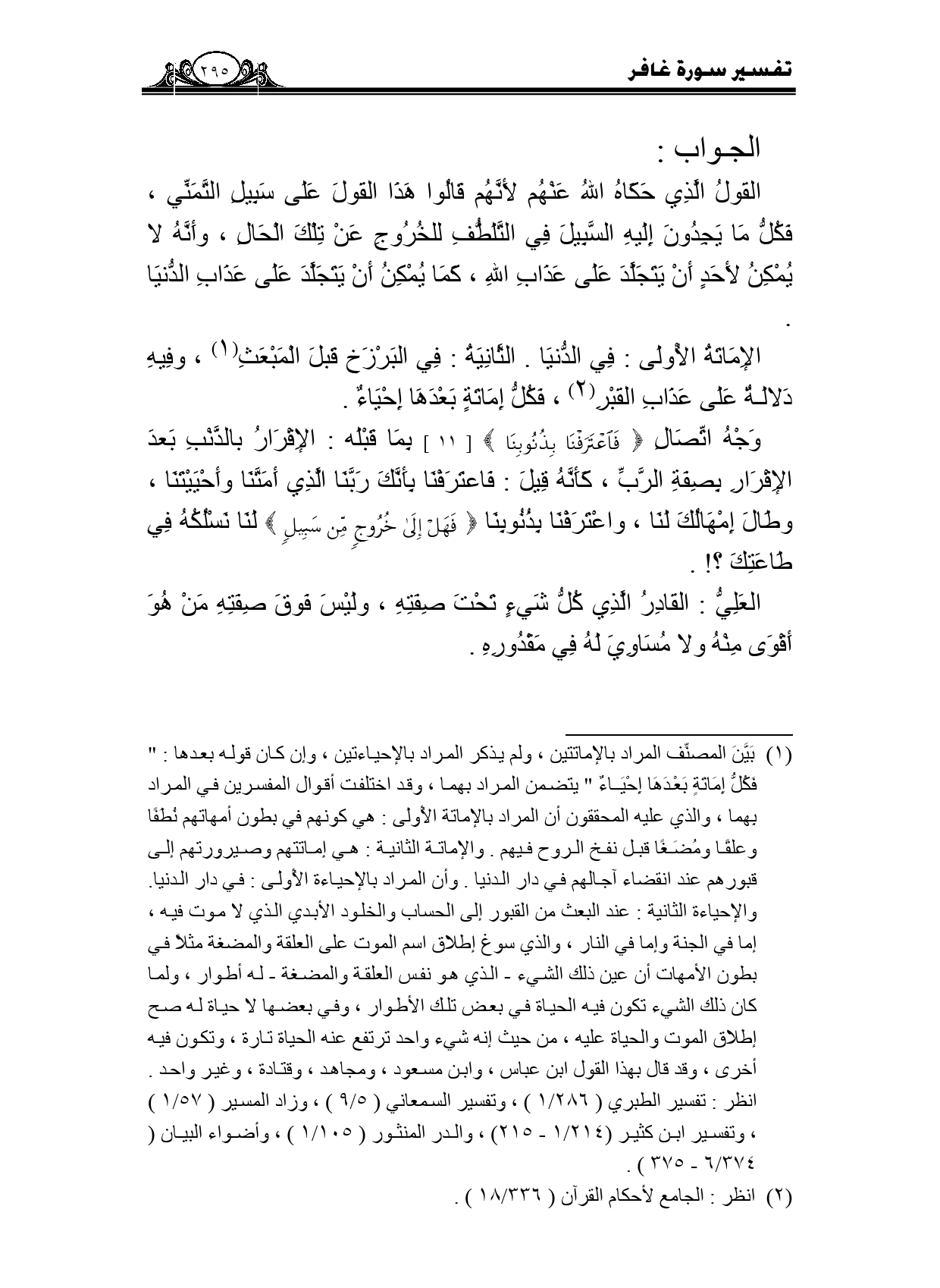 الإماتة الأولى: في الدنيا. الثانية: في البرزخ قبل المبعث، وفيه دلاله على عذاب القبر، فكل إماتة بعدها إحياء.