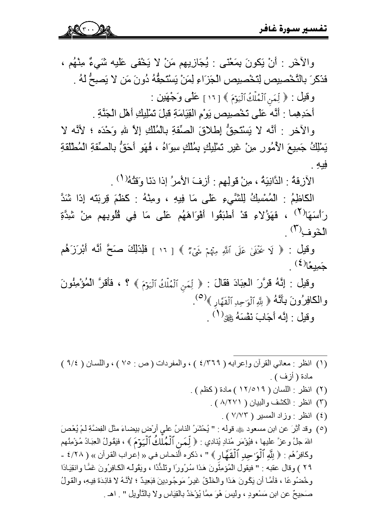 وقيل: {لِمَنِ الْمُلْكُ الْيَوْمَ} [16] على وجهين: