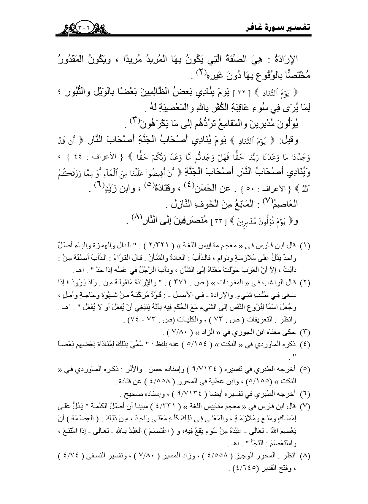 {يَوْمَ التَّنَادِ} [32] يوم ينادي بعض الظالمين بعضا بالويل والثبور؛ لما يرى في سوء عاقبة الكفر بالله والمعصية له.