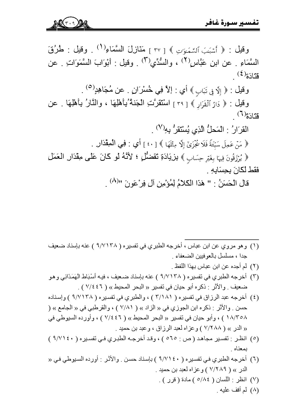 وقيل: {أَسْبَابَ السَّمَاوَاتِ} [37] منازل السماء. وقيل: طرق السماء. عن ابن عباس، والسدي. وقيل: أبواب السموات. عن قتادة.