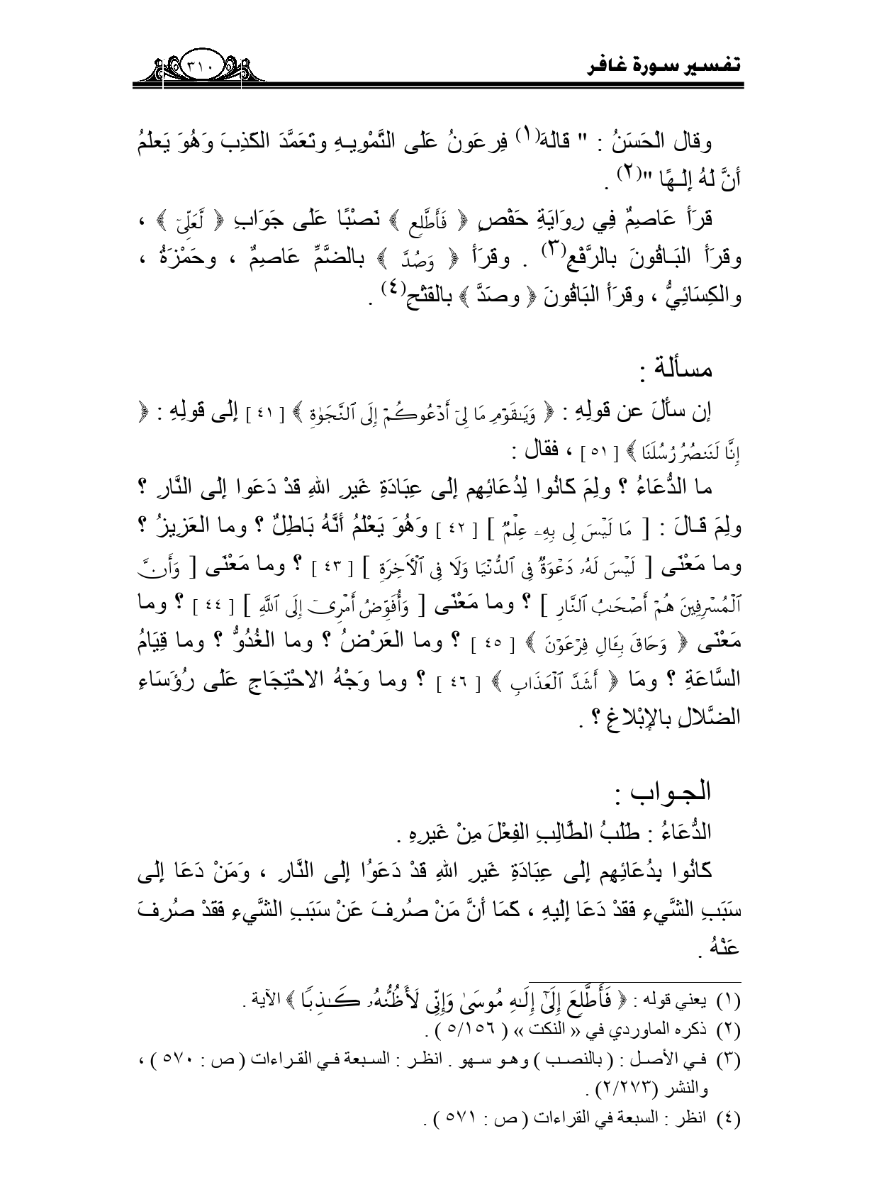 ما الدعاء؟ ولم كانوا لدعائهم إلى عبادة غير الله قد دعوا إلى النار؟ ولم قال: {مَا لَيْسَ لِي بِهِ عِلْمٌ} [42] وهو يعلم أنه باطل؟ وما العزيز؟ وما معنى {لَيْسَ لَهُ دَعْوَةٌ فِي الدُّنْيَا وَلَا فِي الْآخِرَةِ} [43] ؟ وما معنى {وَأَنَّ الْمُسْرِفِينَ هُمْ أَصْحَابُ النَّارِ} ؟ وما معنى {أَمْرِي إِلَى اللَّهِ} [44] ؟ وما معنى {وَحَاقَ بِآلِ فِرْعَوْنَ} [45] ؟ وما العرض؟ وما العدو؟ وما قيام الساعة؟ وما {أَشَدَّ الْعَذَابِ} [46] ؟ وما وجه الاحتجاج على رؤساء الضلال بالإبلاغ؟